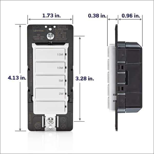Add a way to automatically turn off lights or an appliance at home with the Leviton Decora In-Wall Countdown Timer Switch (2, 5, 10, 15 Min). This in-wall auto-Off timer can easily be installed by replacing a standard wall switch. It adds four preset timer buttons and a single Off button, allowing you to select when the timer automatically turns the load Off. To extend the On time, simply press and hold any timer button. To turn the load Off manually, press the Off button. This timer switch can control LED, CFL, incandescent, halogen, magnetic low voltage, electronic low voltage, fluorescent, fans, or motor loads. It functions as a single-pole switch (15 Amp, 120 VAC) and is ideal for porch and landscape lighting, interior lights, bathroom exhaust fans, heat lamps, garages and more. Wallplate sold separately. Can be installed with or without a neutral wire. Ground wire is required. Do not use it to control lights if there is no other light source in the space. Model Part #: DT115-1LW.