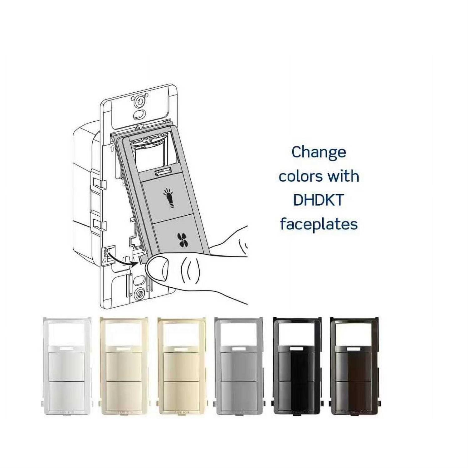 The humidity sensor detects excess humidity in a room and automatically activates an exhaust or ventilation fan helping to reduce condensation and provide a more comfortable environment. The sensor uses state-of-the-art digital sensing technology to continuously monitor and manage moisture levels in areas of the home prone to humidity like bathrooms, basements, laundry rooms and spas. The separate light switch can be pressed to turn on and off lighting, a towel warmer or a heater. Easy DIY install with slim depth for an easier fit in the wallbox and a green flex sleeve that connects to ground or neutral when the sleeve is removed. User-friendly customization to adjust sensitivity, humidity level and time out settings and easy color change using the DHDKT faceplates available in white, ivory, light almond, gray, black and brown. Use with Decora Wallplate and Decora Plus Screwless Wallplate sold separately.