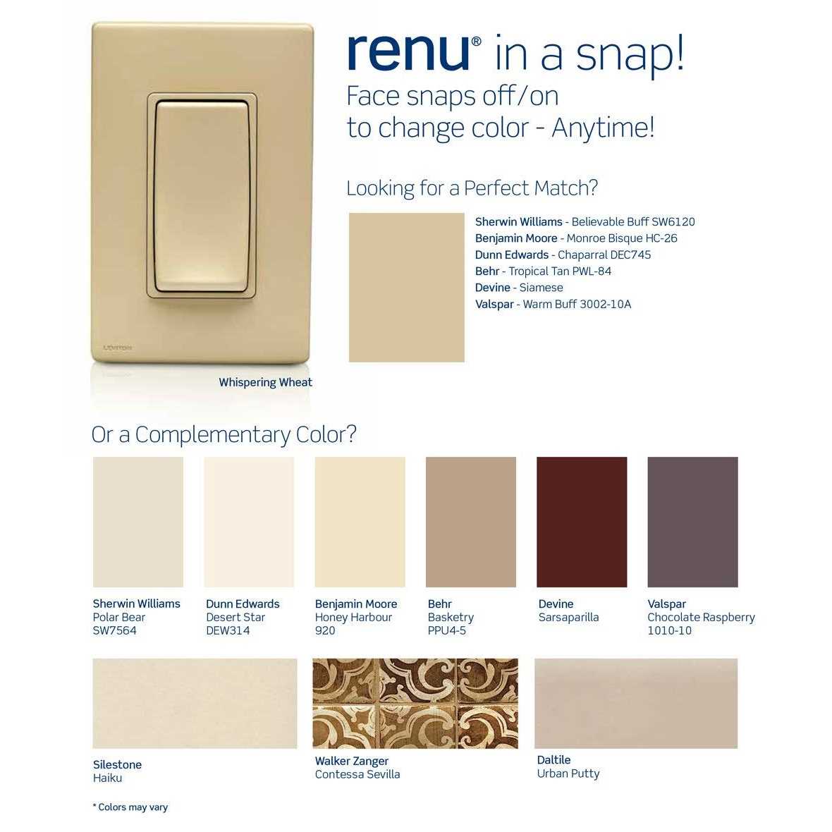 Renu in a snap! Renu is the smart new line of decorative electrical products from Leviton. Install Renu and get a fresh stylish look, plus the ability to change the color of any Renu device when you update a room. The line includes switches, outlets, GFCIs, dimmers, and sleek, screwless wallplates available in 20 designer colors. The Renu face plate RKG20 makes it a snap to change the color of Renu 20A tamper-resistant GFCIs, without rewiring or needing an electrician. Just order a face plate in the color of your choice and follow the simple directions to replace the existing face with a new hue. Snap on a wallplate (sold separately), and you’re done.