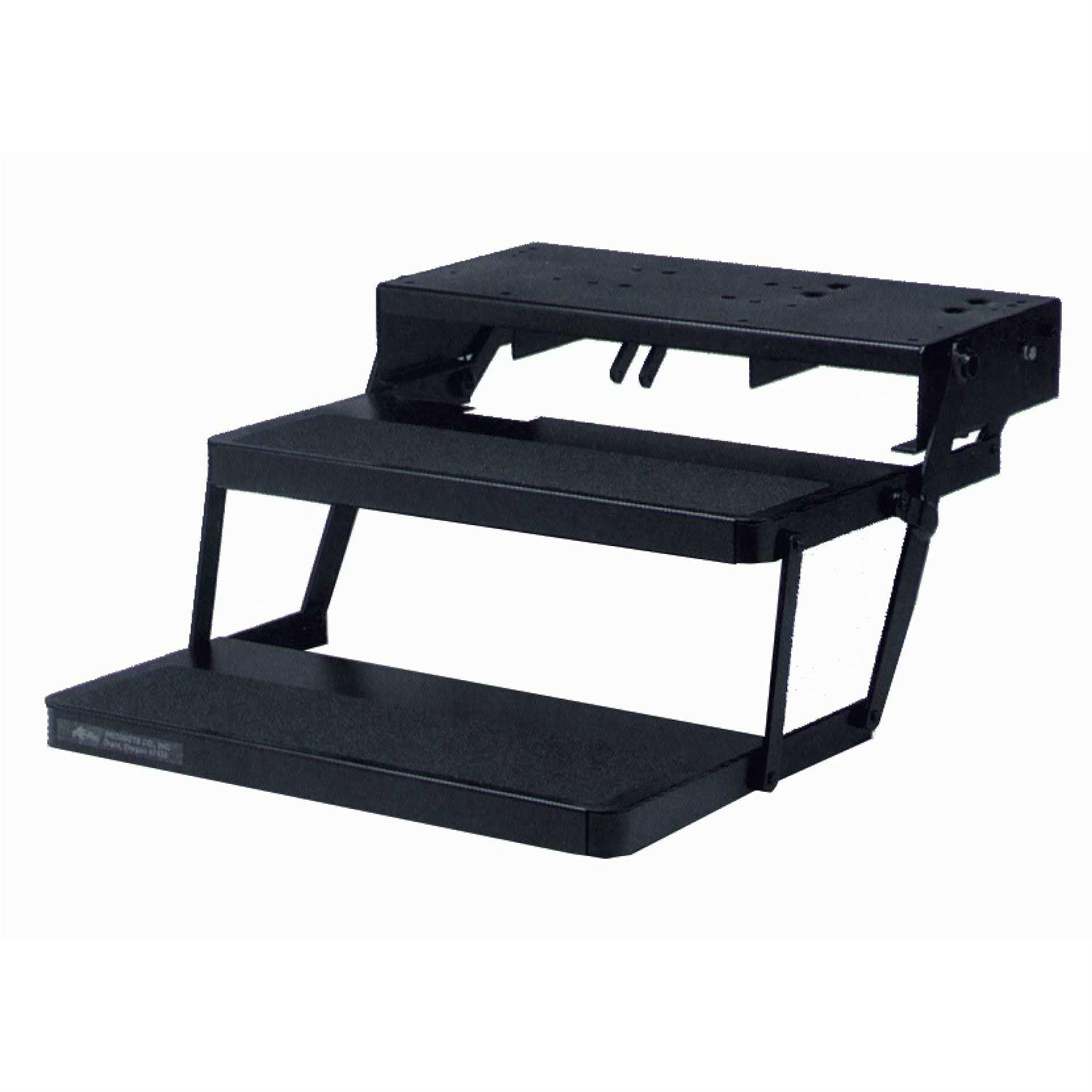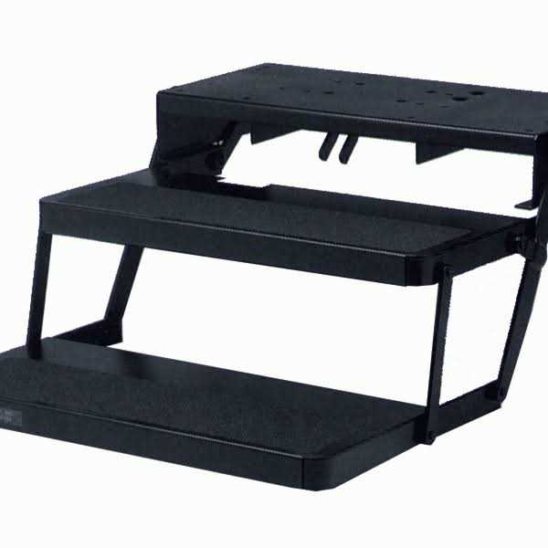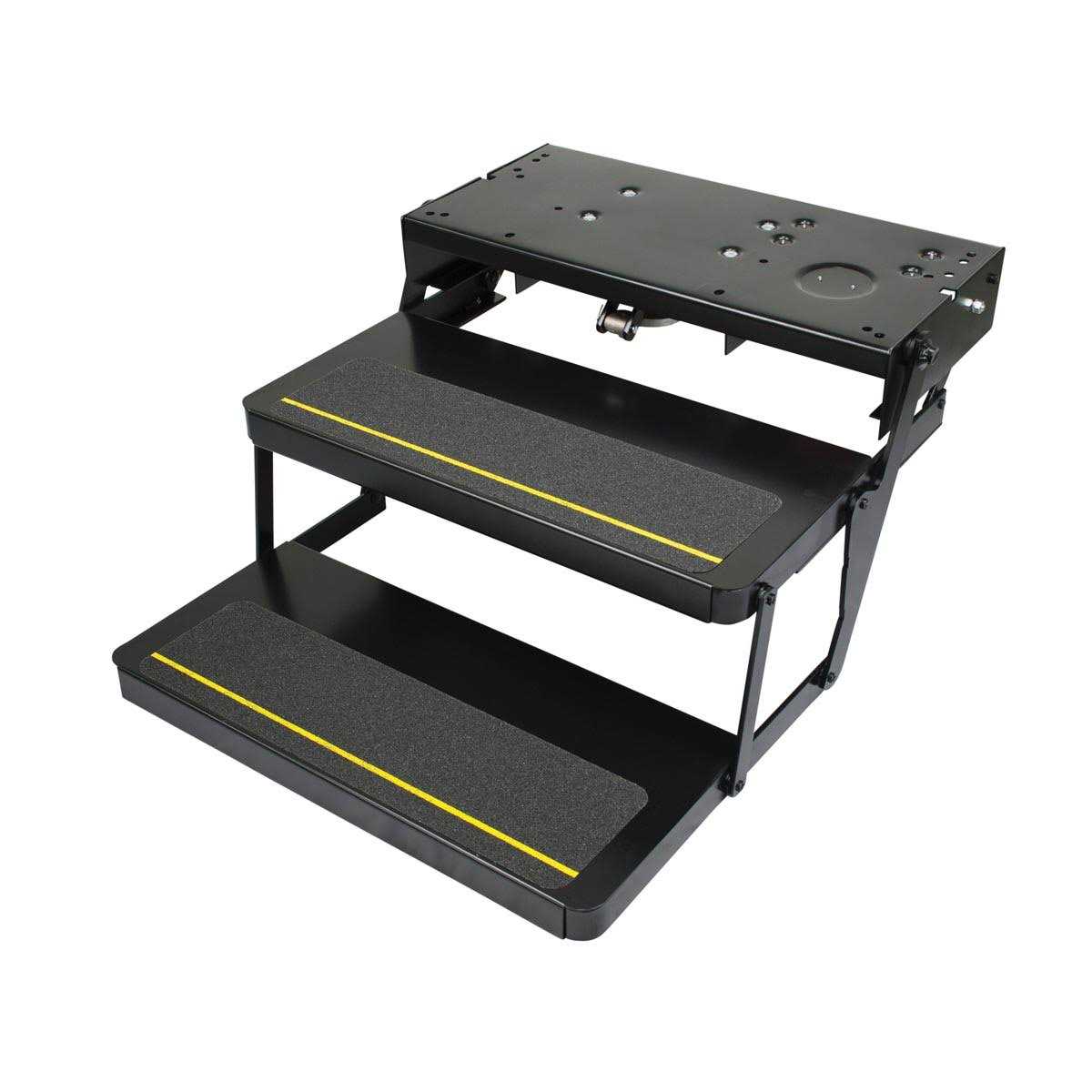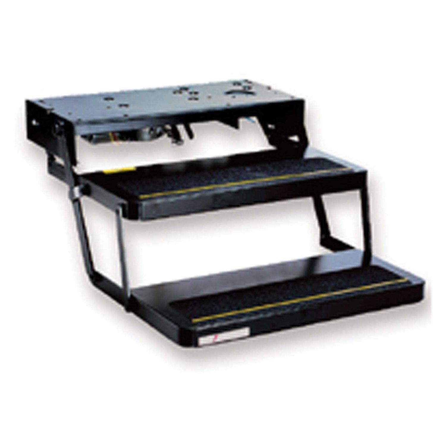 Rugged, welded steel construction. Durable, powder coated finish. Automatic extension when door opens. Automatic retraction with ignition. Automatic safety stop when step meets resistance.