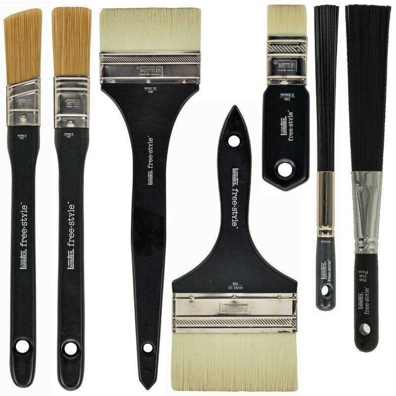 Liquitex Freestyle Large Broad Flat Brushes are the ideal tools for acrylic artists working in both large and small scales. These brushes stand up to texture gels, mediums, and even water-mixable oils. Liquitex Freestyle Large Broad Flat Brushes feature ergonomic handles for hours of comfortable use. Liquitex Freestyle brushes offer ideal spring and snap for all acrylic applications, but they can also be used with water-mixable oil paints, and they stand up well to texture gels and mediums. Long, Long Handle – The long contoured handles provide extra comfort when holding the brushes at the tails, but they’re also nicely balanced to provide perfect control when held below the ferrule. These brushes are easy to grip, for quick, broad, gestural strokes on large-scale work. It can also be used for varnishing. Short Handle -This brush is ideal for dragging, figuring, and varnishing large surfaces and walls with broad, gestured strokes. *Note: Brush sizes are not standardized. Since brushes are handmade, expect some variation even among brushes from a given manufacturer.