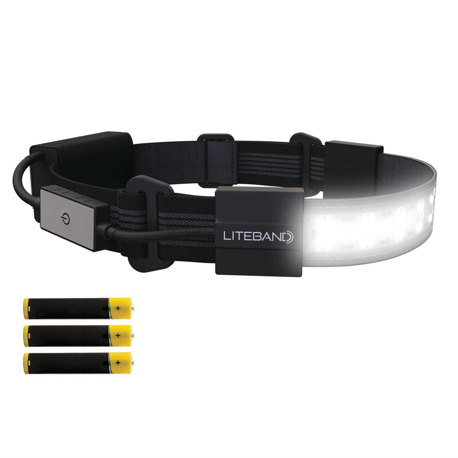 The Liteband FLEX 300 Headlamp is a lightweight, comfortable, and flexible headlamp that illuminates the entire area in front of you without weighing you down. It features a strip of 20 LEDs in a durable but flexible silicone housing to deliver up to 300 lumens of wide angle illumination so there is no need to move your head to illuminate the area. Powered by 3 AAA alkaline batteries, the Liteband FLEX 300 is great for hiking, biking, running, fishing, boating, dog walking, and other outdoor activities. It features an easy to use, 2 mode switch to provide a full range of illumination and maximum control of run time. The low profile design and balanced, no-bounce weight distribution creates the perfect fit and ultimate comfort so you can wear it all day without dimples or dents. It easily fits over hard hats or helmets too, making it the perfect solution for work and play. This portable, hands-free light also features durable, IPX2 water-resistant materials and reflective details ideal for firefighters, mechanics, plumbers, electricians, and other professionals. Comfortable enough for daily wear, this LED Headlamp provides a wider, brighter, longer lasting light than traditional headlamps.