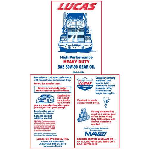 Gear oils have needed improving for years, especially in the high performance industry. The Lucas 80W-90 enjoys the technology Lucas developed in making the “Lucas Heavy Duty Oil Stabilizer”, the number one supplemental oil in the heavy duty industry. This gear oil formula is fortified with special anti-wear agents and lubricity agents to control wear and drag as well as special additives to control heat. These features are not found in ordinary gear oils.