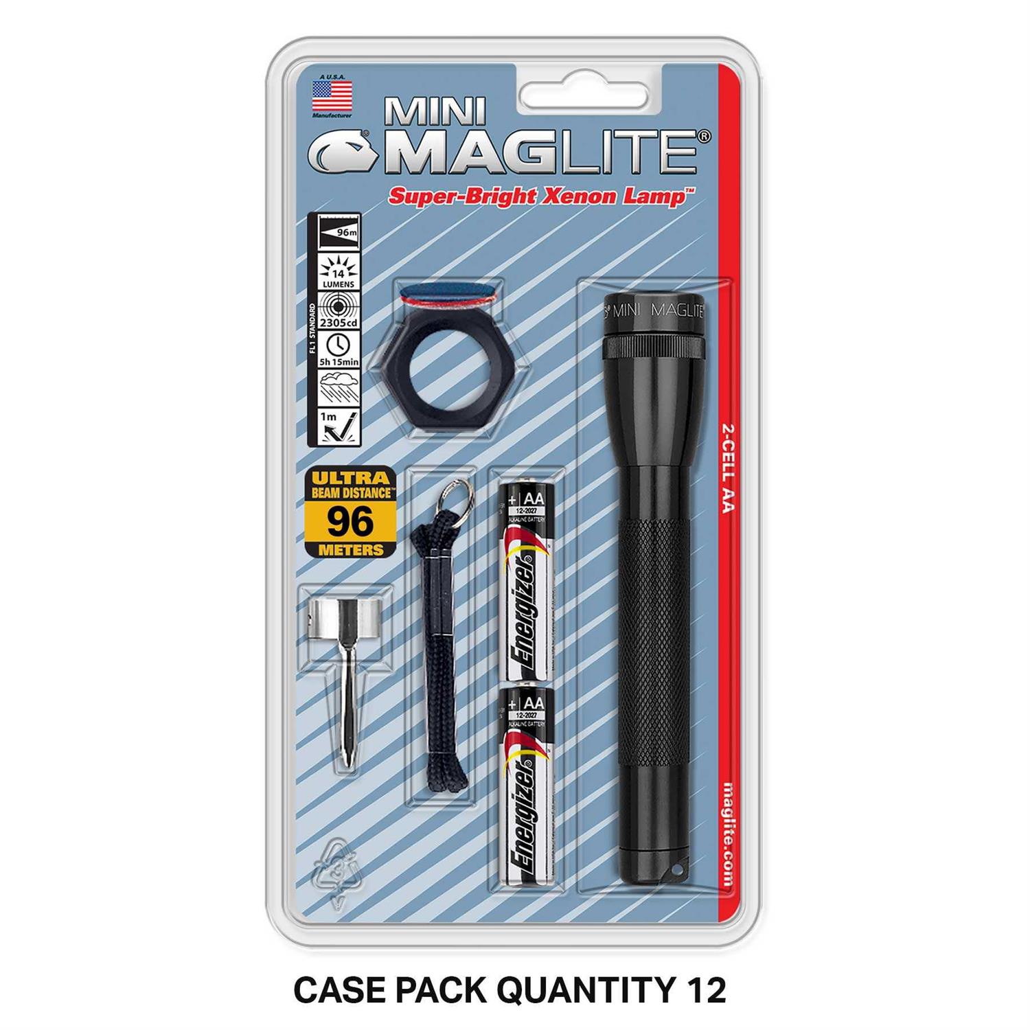 Flashlights offer high-intensity adjustable light beam from Spot to Flood. Made using rugged, machined aluminum alloy casing with a knurled design. Anodized inside and out for improved corrosion resistance. O-ring sealed for water and shock resistance. Includes a spare lamp safely secured inside the tailcap. Mini-Maglite 2 Cell AA Flashlight features a candle mode that converts quickly to candle-style lighting. Combo pack includes: a Mini Maglite AA flashlight; pocket clip; lanyard wrist strap; lens holder; red, blue, and clear lenses; and two AA cell batteries.