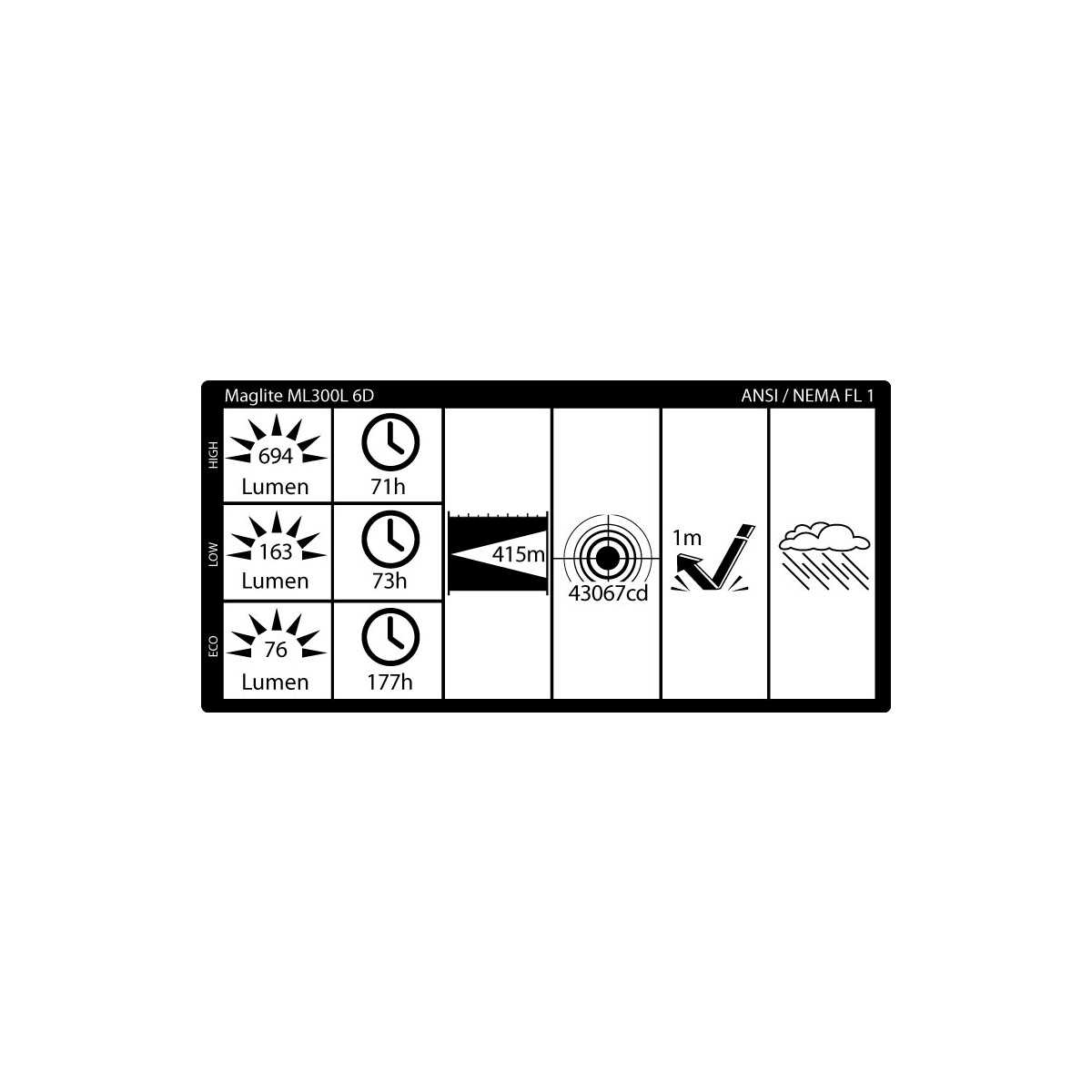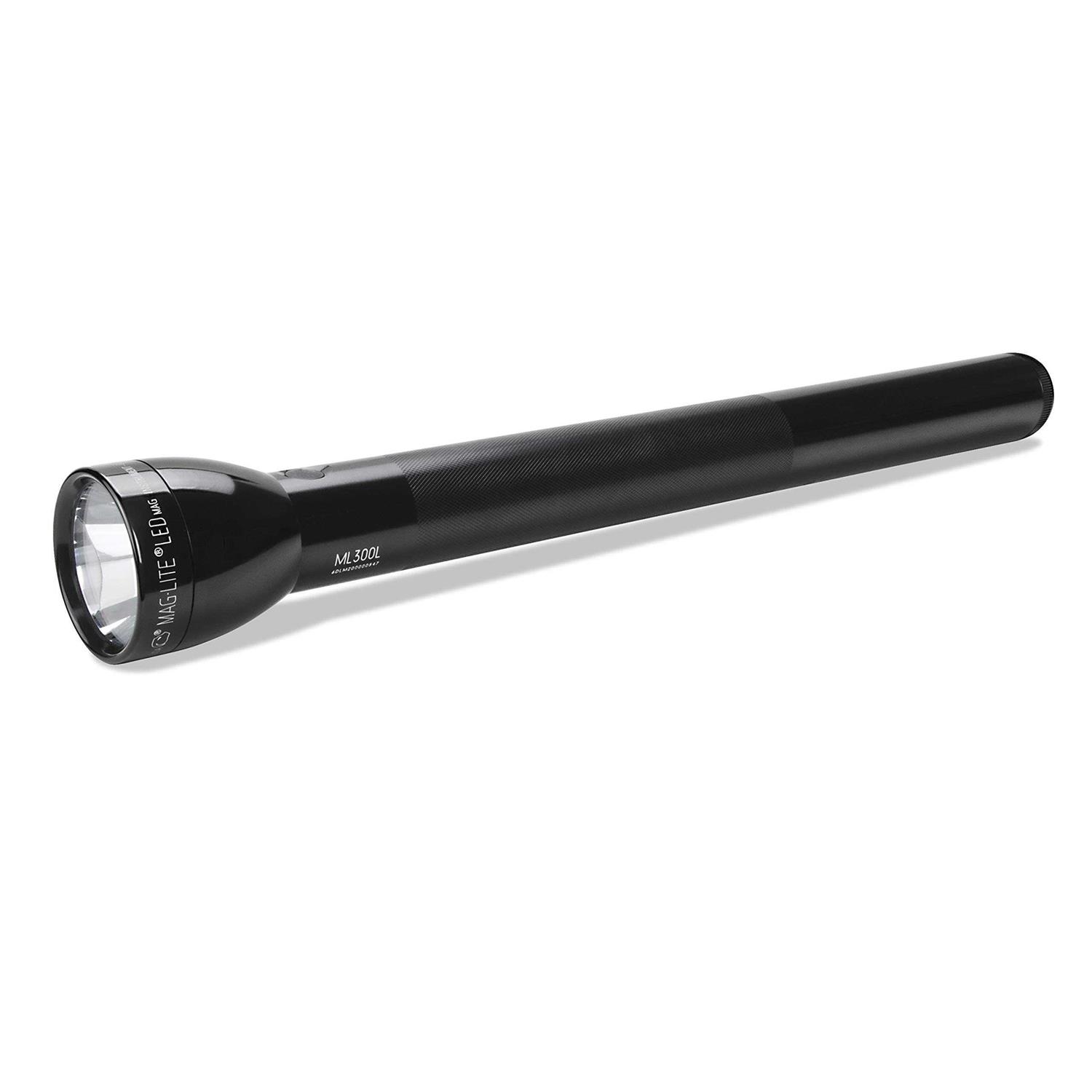 Features 76 / 163 / 694 Lumens. Single White-Light LED. Disorientating Strobe Mode. Focusable Beam from Flood to Spotlight. Single Pushbutton Body Switch. Momentary and Constant-On Activation. Anodized Aluminum Housing. Impact and IPX4-Rated Water Resistant. Runs on Six D-Cell Alkaline Batteries. Maglite’s black ML300L 6-D Cell LED Flashlight maintains their iconic look with the added versatility afforded by today’s LED technology. Its wide output range is complimented by a disorientating strobe and their equally-iconic focusable beam. In less than a 1/4 turn of the head the beam can be set from a wide flood to a tight spotlight to further increase its usability. A single pushbutton switch on the body provides access to the three output intensities plus the strobe for simple operation even in stressful situations. To stand up to the rigors of daily use the body is made of a lightweight and durable aluminum alloy with a black scratch and corrosion-resistant anodized finish.