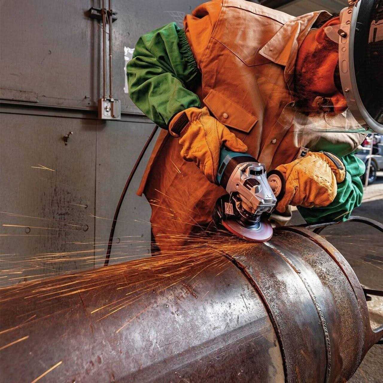 SJSII High-Power Angle Grinder w/Brake (GA4591) features a powerful 15 AMP motor that delivers more output and features a variable speed control dial that allows the user to adjust RPM from 2,800 – 11,500 to match the speed to the application. The High-Power Angle Grinder features SJSII, which uses a leaf spring and cam gear drive mechanism that is engineered to reduce vibration for increased operator comfort during extended use. Vibration is further reduced by the vibration absorbing side handle which provides increased comfort on the job. The GA4591 features an Electronic Controller that provides soft start, which is designed to suppress start-up reaction for smooth start-ups and longer gear life. The High-Power grinder features labyrinth construction seals and protects the motor and bearings from dust and debris for longer tool life. The motor fan is designed with enlarged fins for increased air flow and a cooler running motor. The GA4591 features spiral bevel gears for smoother rotations and a more efficient transfer of energy. It features a fully aluminum constructed gear housing which provides superior gear alignment and smooth transmission for increased durability and comfort. An Electronic Controller provides an electronic current limiter which helps protect the motor from overload in high torque applications.Convenience features include a in. tool-less in. wheel guard for easy adjustment, and a slide switch with lock-on for continuous use.