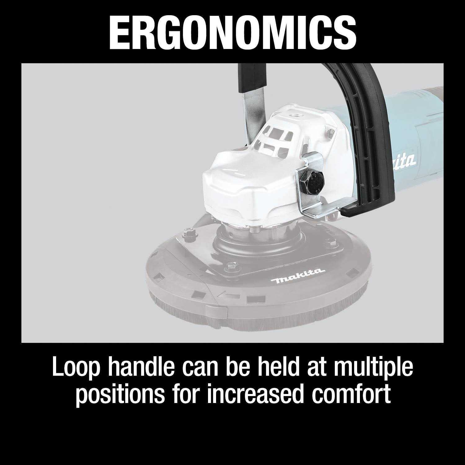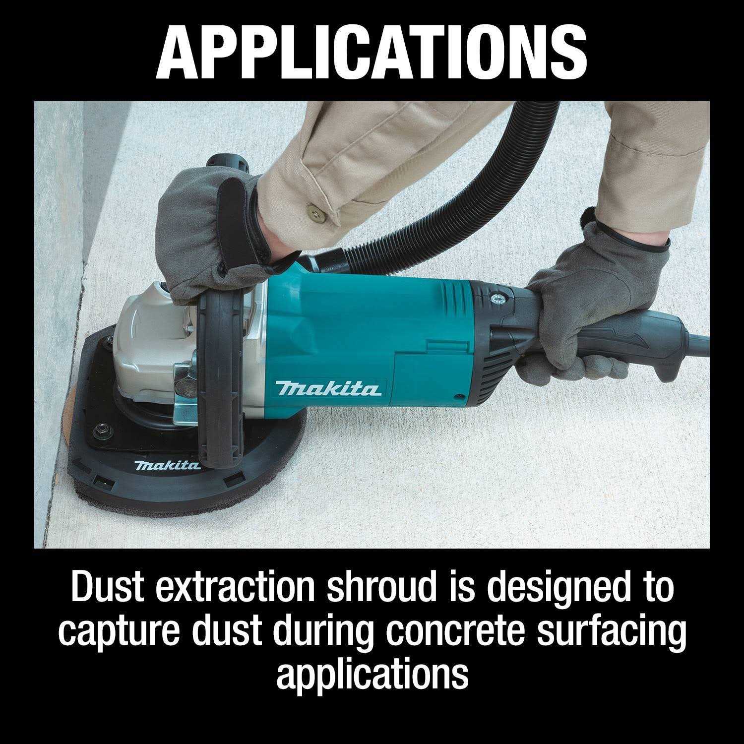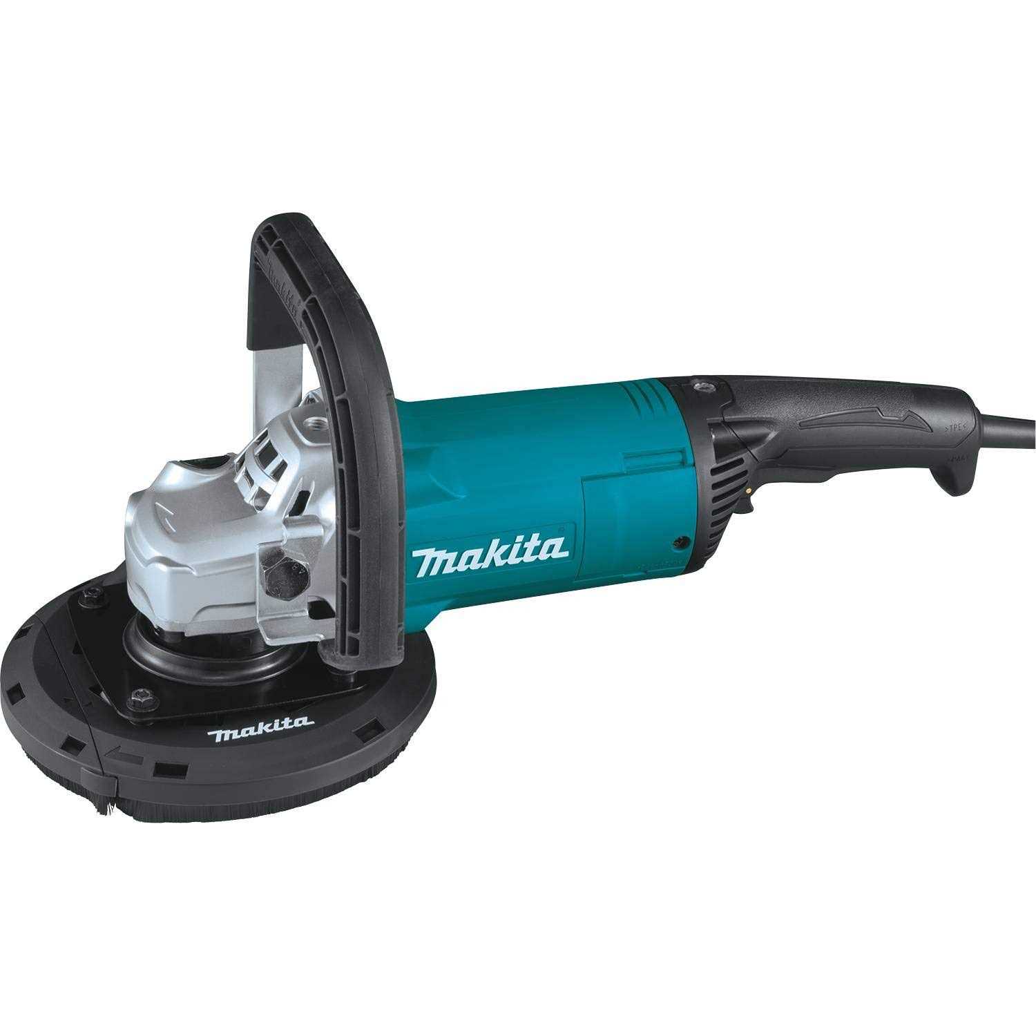 The Makita 7” Concrete Surface Planer with Dust Extraction Shroud (GA9060RX3) combines power and ease-of-use with superior handling in a compact size. It is engineered for concrete finishing, concrete material removal and surface coating removal. The GA9060RX3 is powered by a 15 AMP motor, which delivers 6,600 RPM for optimum performance. A soft start provides smooth start-ups for longer gear life. Anti-restart protection is designed to prevent motor start-up in the on-power switch position should power be disrupted. The integrated dust extraction shroud is designed to capture dust during operation and includes a removable dust shroud cap that allows the tool to plane in corners and against walls. The shroud has soft brushes to help prevent dust from escaping, and the 4-spring suspension system keeps the shroud flush with the surface during movement. The concrete planer has an ergonomic soft grip and rear-handle trigger switch with lock-off function, as well as an ergonomic loop handle for improved comfort. It is compact, measuring 17-3/4” long and weighing 12.4 lbs. Use it with 7” Diamond Cup Wheels for lower vibration and fast material removal.