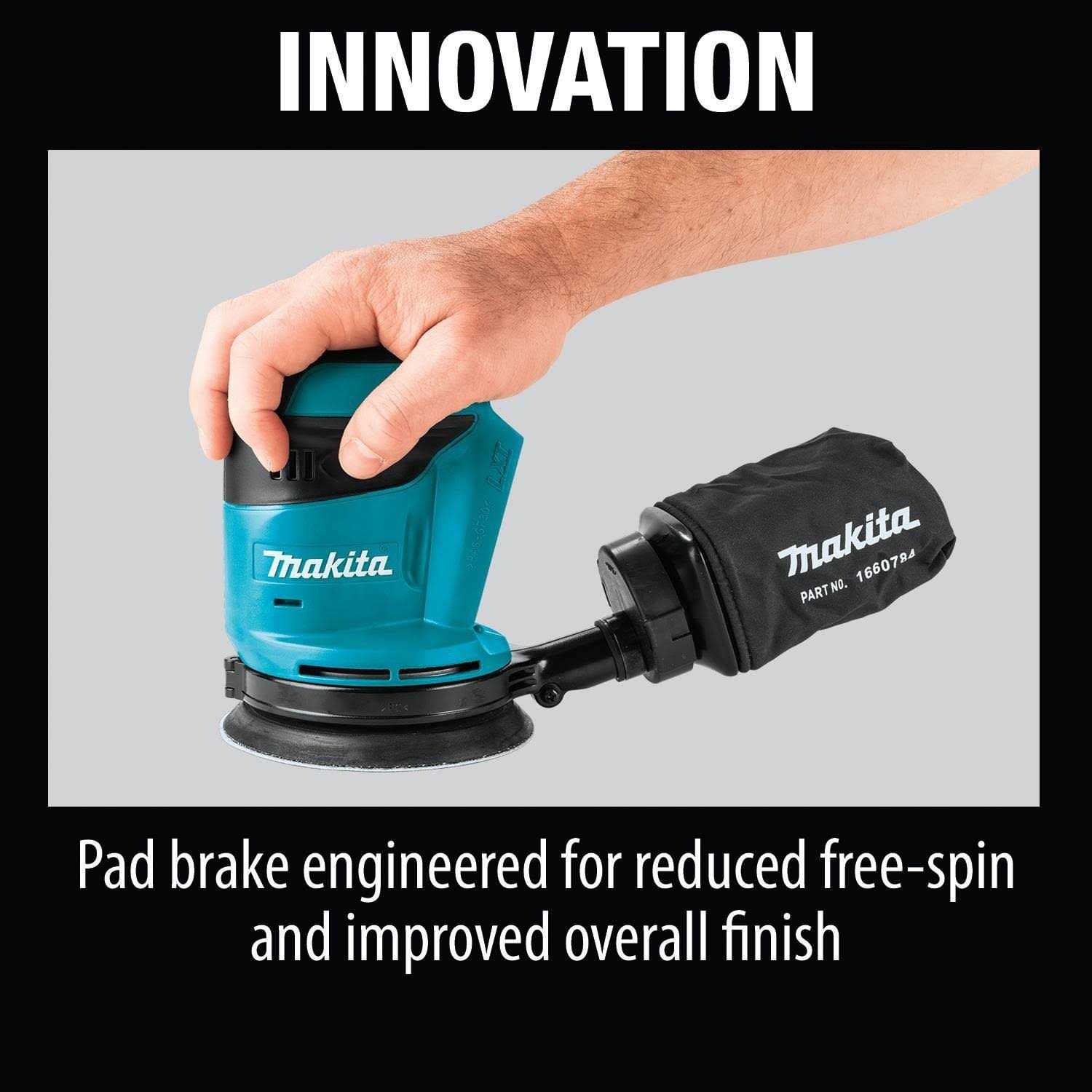 The XOB01Z features three speed settings, superior ergonomics and up to 40 min of run time on a single charge (battery sold separately). Match the speed to the application with three speed settings (7000/9500/11000 opm), which are easily changed with a one-touch electronic control switch. The large 1/8 in random orbit action is engineered for efficient sanding, fast material removal and a swirl-free finish. The pad brake reduces free spin for improved overall finish and a control system regulates pad speed at start up. The XOB01Z uses quick change 5 in (8-hole) hook-and-loop abrasive paper for increased versatility. It’s part of Makita’s expanding 18 V lithium-ion series, the world’s largest cordless tool line up powered by an 18 V lithium-ion slide style battery. Makita 18 V lithium-ion batteries have the fastest charge times in their categories, so they spend more time working and less time sitting on the charger. For improved tool performance and extended battery life, Makita created Star Protection Computer Controls. Star Protection is communication technology that allows the Star Protection equipped tool and battery to exchange data in real time and monitor conditions during use to protect against overloading, over discharging and overheating. For increased versatility, the tool can also be powered by Makita 18 V LXT and compact lithium-ion batteries with the star symbol on the battery indicating Star Protection inside.