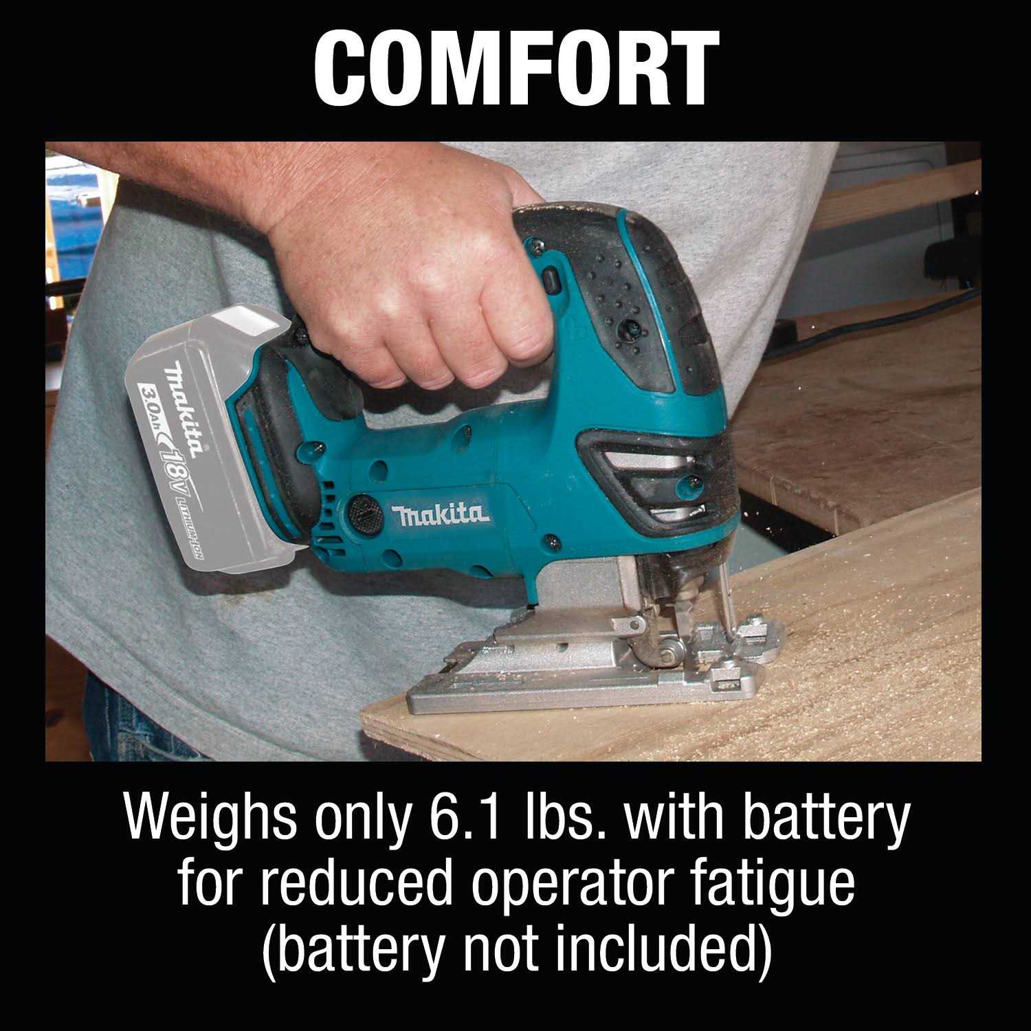 Makitas 18V LXT Lithium-Ion Cordless Jig Saw seamlessly combines precision and power with the lowest overall weight in its class. The XVJ03Z has a range of precision and comfort features for precise jigsaw cutting performance. Makita 18V Lithium-Ion batteries have the fastest charge times in their categories, so they spend more time working and less time sitting on the charger. For improved tool performance and extended battery life, Makita created Star Protection Computer Controls. Star Protection is communication technology that allows the Star Protection-equipped tool and battery to exchange data in real-time and monitor conditions during use to protect against overloading, over-discharging, and overheating. This cordless jigsaw has lower vibration and less noise for more control and comfort. The XVJ03Z has 4 position cut settings (3 orbital and 1 straight) for fast and efficient cutting in all applications and a tool-less push-in lock system for quick blade changes. The blade roller guide is positioned close to the workpiece for precision accuracy in straight and bevel cuts. The Makita Cordless Jig Saw is engineered for any who requires a best-in-class engineered cordless jigsaw.