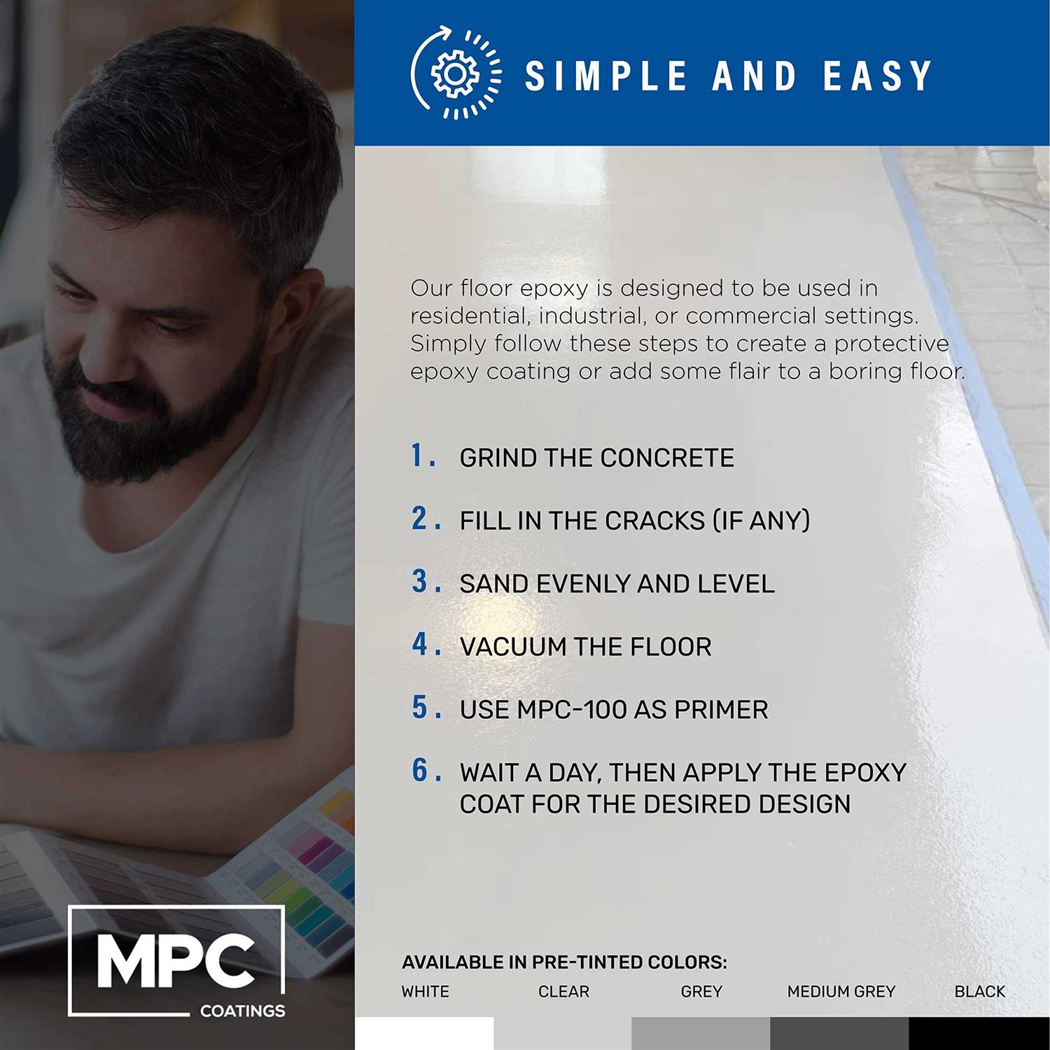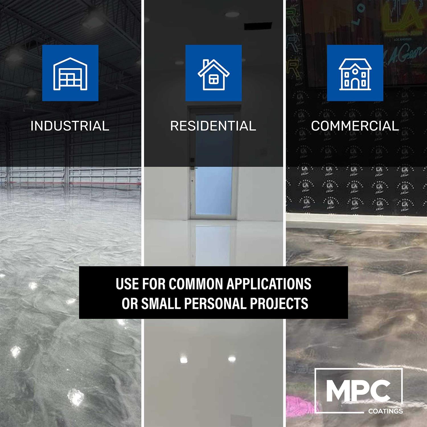 MPC-100 is a 2-component, 100% solids, self-leveling, and high-build epoxy floor coating. It is designed to be used as a protective floor coating on concrete, over an existing epoxy coating, or to create metallic/decorative flooring systems. It can also be used as the binder component for resurfacing or patching surfaces exposed to severe and aggressive industrial environments. MPC-100 is a specifically formulated cycloaliphatic coating that reduces water spotting and amine blushing while providing excellent adhesion, abrasion, impact, and chemical resistance. This coating contains no solvent, is compliant with the CFIA regulations for indirect food contact, and meets the VOC regulations limit of under 100 g/L for architectural floor coatings. Areas of application – Industrial Use – Garages; Warehouses; Airports and hangars; Processing and manufacturing plants to Commercial Use – Shopping malls and boutiques; Hotels; Offices; Showrooms; Restaurants; Hospitals; Schools; Community centers, Bar Tops, Table Tops. Residential Use – Entrances and hallways; basements; entertainment rooms; bathrooms; kitchens and living rooms; outdoors spaces and pool outlines, Table Tops.