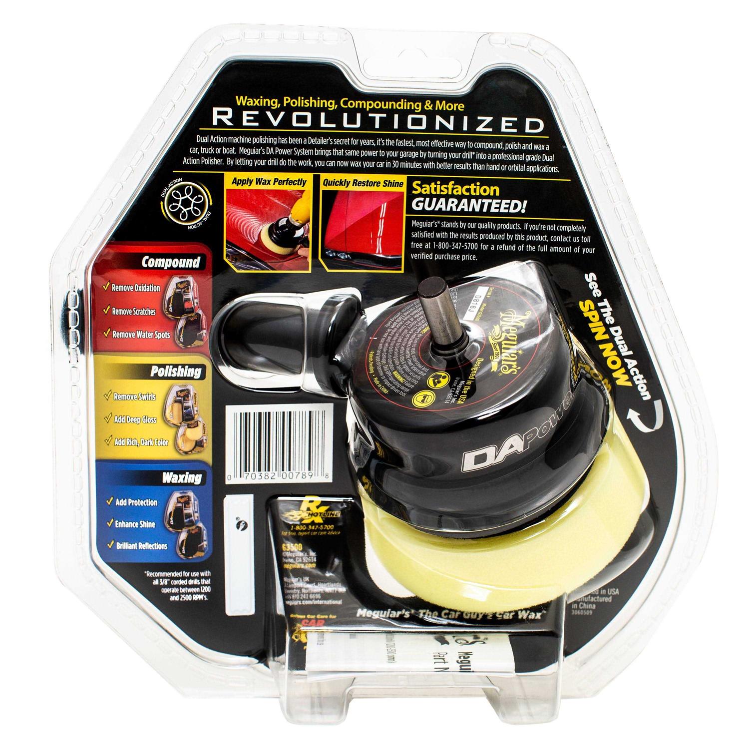 Great for waxing, polishing, compounding, and carpet and interior Wax your whole car in less the 30 minutes Dual-Action motion allows you to remove defects and apply polishes and waxes without harming your paint Attaches to most standard household drills. Recommended for use with 3/8″ corded drill that operates between 1200-2,500 RPM’s For best results use with DA Compound Power Pack G3501 to remove defects, DA Polishing Power Pack G3502 to enhance gloss and shine, and DA Waxing Power Pack G3503 to protect Waxing and polishing your car or truck by hand can be exhausting. Cut your do-it-yourself car care time in half with the Meguiar’s Dual Action Power System. It attaches to a household drill so compounding, polishing and waxing can be done in half the time.