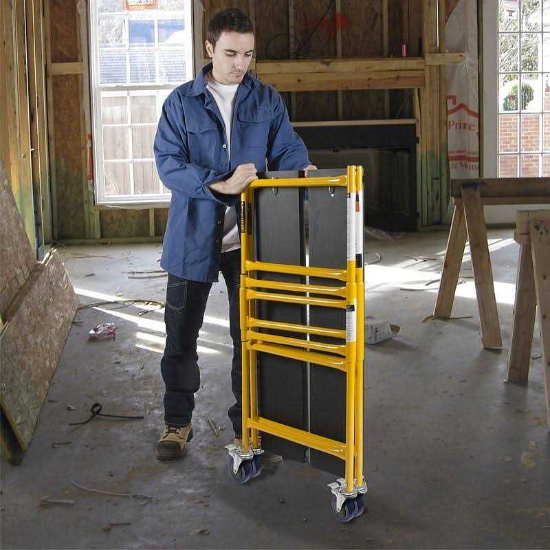 Your utmost safety is guaranteed when using the Jobsite Series Baker 4 ft. Metal Mini Scaffold Platform with Wheels and Fold Away Tool Shelf, thanks to sturdy materials comprised of rugged square steel tubes and slip-resistant steel-reinforced plywood platforms. It comes with handy parts and accessories tray shelf organizer. It’s multi-level platform can also function as a workbench for your miter saw or a dolly roller work cart. Its heavy-duty, double-locking 4-in. caster wheels make it easy for rolling and transporting materials for any home project, such as painting drywall, or any other construction job. With this scaffolding, you can reach up to 9 ft. at working heights of 10 to 21.5 to 33 in. (25 to 55 to 84 cm). Plus it can hold a weight capacity of up to 500 lbs. while still being perfectly lightweight and portable. This mini utility scaffold is designed for interior use. Our products are specifically suited for residential, commercial, and industrial construction.