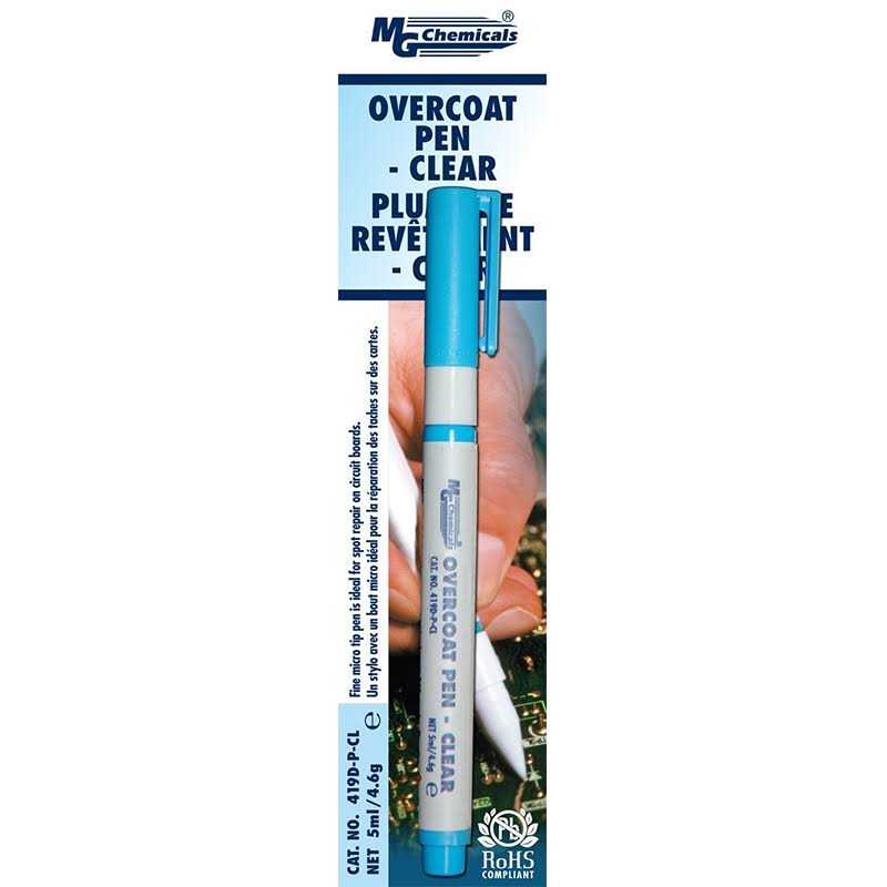 Overcoat Pen Clear Our 419D Overcoat Pen are solder resist coatings that are a fast drying, xylene and toluene free. The pen provides an excellent finish in multiple colors. They are ideal for high moisture environments and applications requiring easy repair and rework. Applications & Usages The 419D pen protect area of a printed circuit board from taking solder, helping confine solder to intended areas only. This prevents formation of unintentional solder bridges, which could cause short circuits. It also protects electric circuits against moisture, dirt, dust, thermal shocks, and scratches that could corrode, or otherwise damage the electric components. It insulates against high-voltage arcing, shorts, and static discharges. The 419D pen improves reliability, operational range, and lengthens the life of electrical and electronic components and assemblies. Its primary applications are in the automobile, marine, aerospace, aviation, communication, instrumentation, industrial control equipment, and consumer electronics industries.