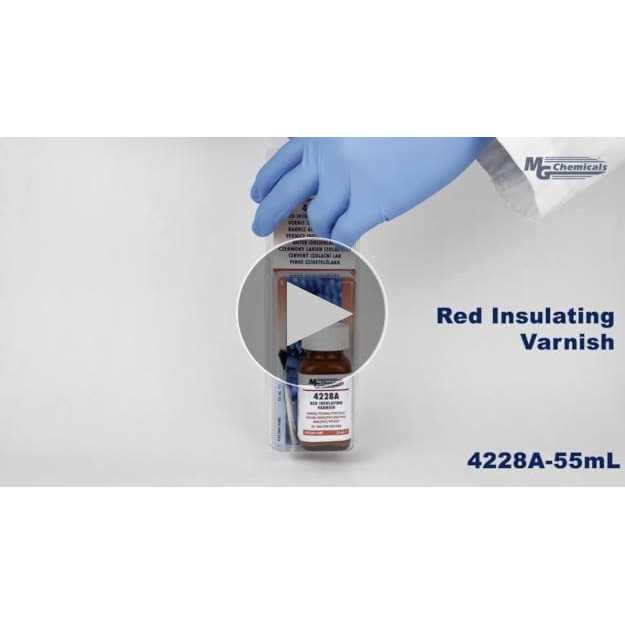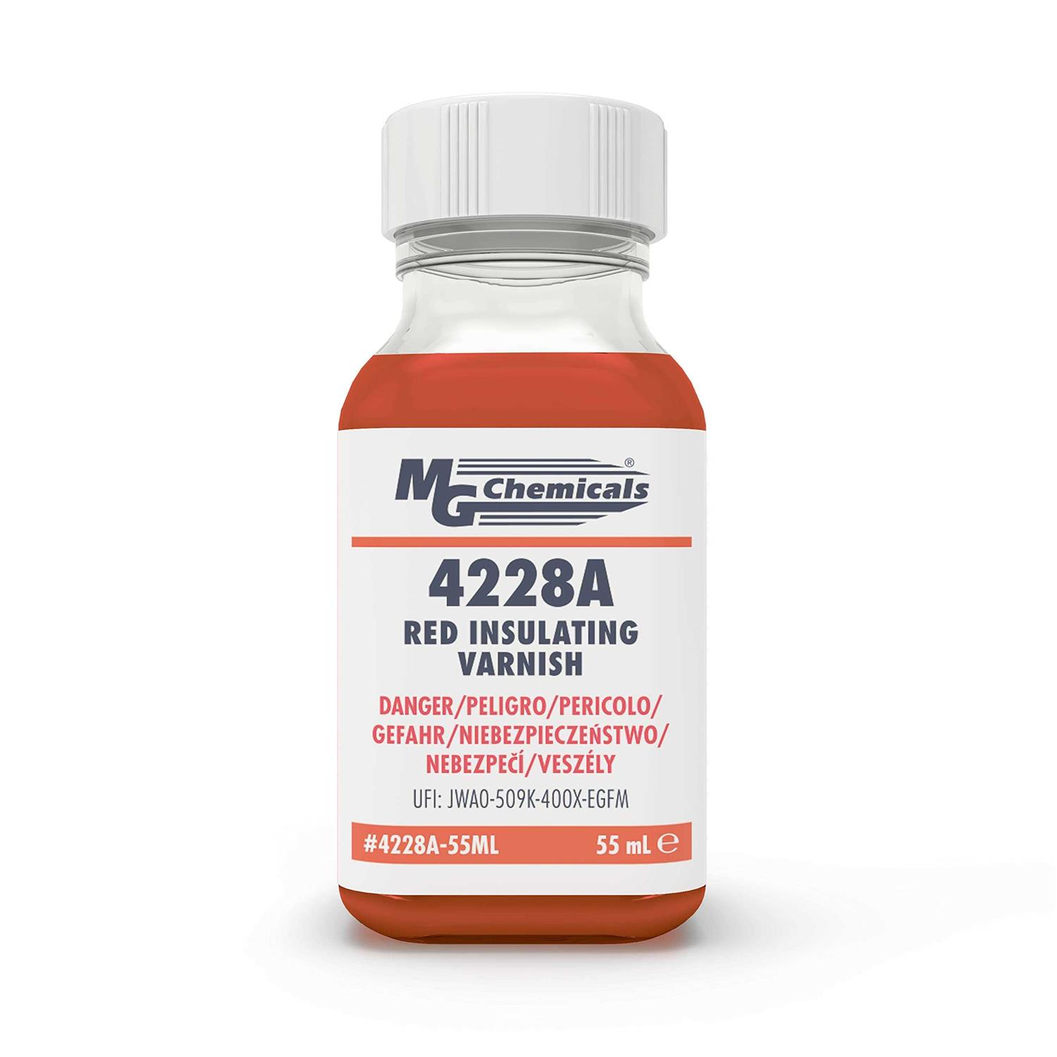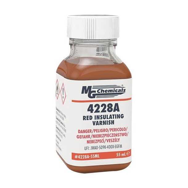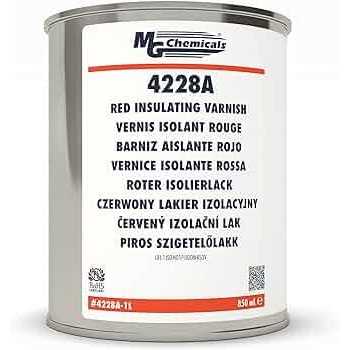Red Insulating Varnish 4228A MG Chemicals4228A MG Chemicals is an easy-to-use, HAPs-free, 1-part, low-viscosity insulating varnish that cures at room temperature and adheres well to many substrates including metals, glass and most plastics. This varnish insulates high-voltage parts such as motor windings and transformer coils against arcing and discharge as well as protects metals from corrosion.The coating’s distinct red color helps operators easily inspect coating coverage; however, for a clearcoat option, consider the 4226A MG Chemicals.