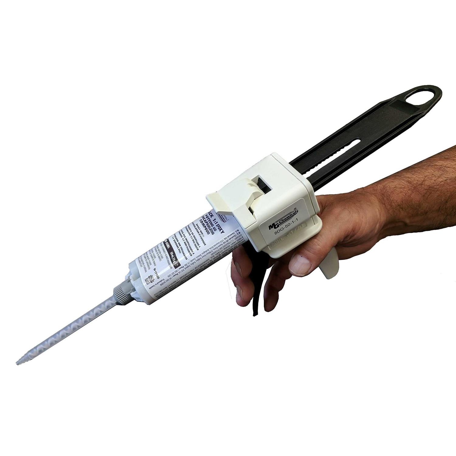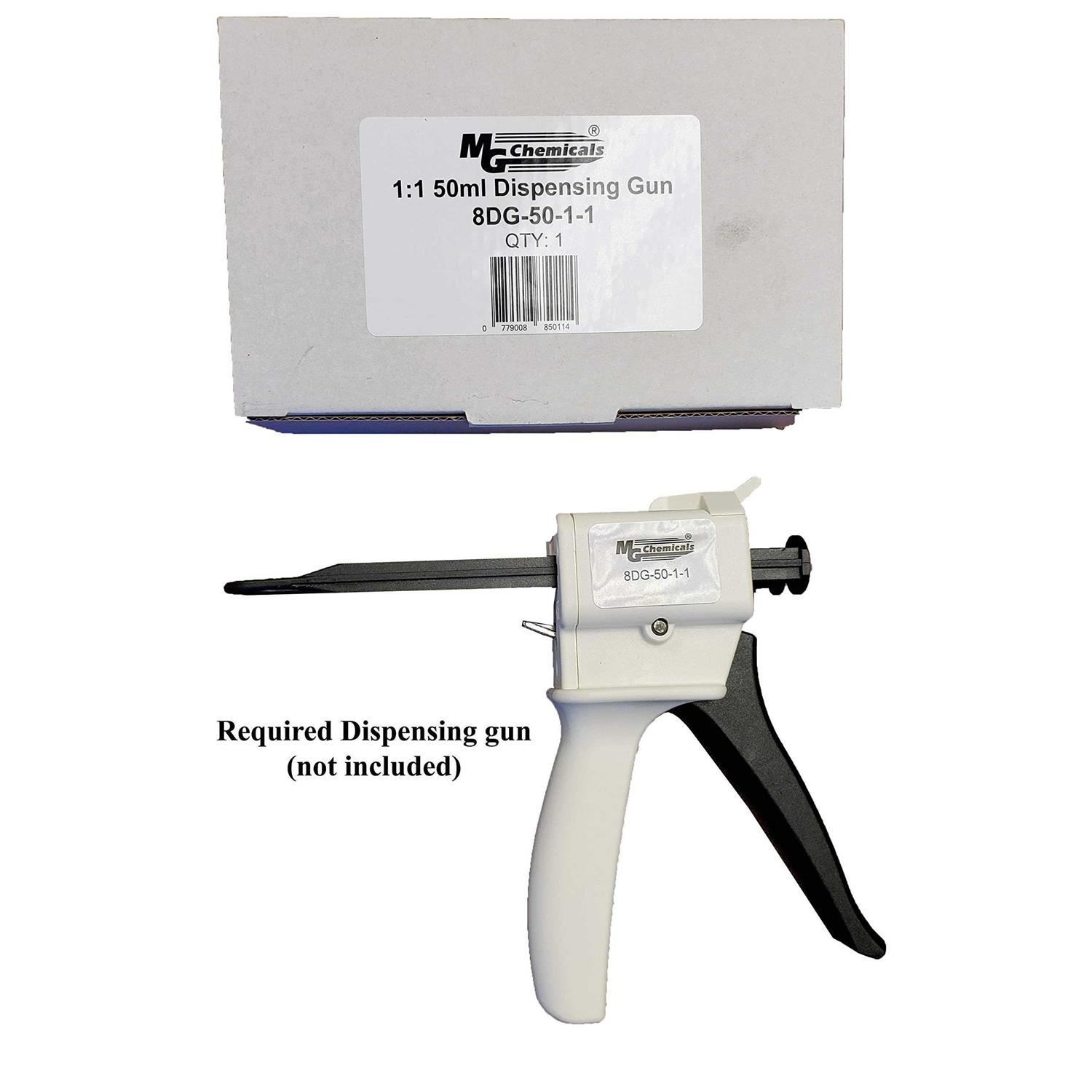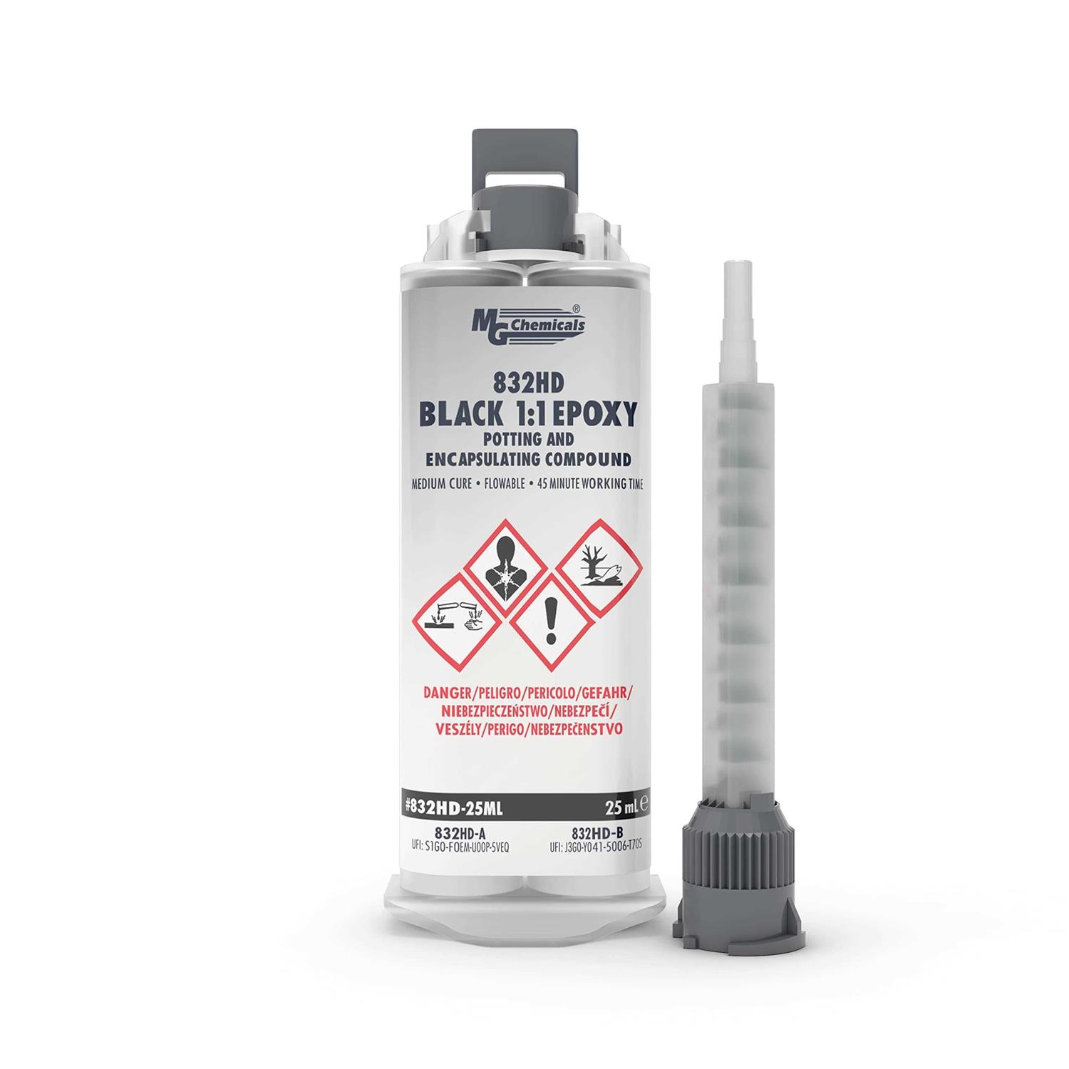 MG Chemicals – 832HD-50ML 832HD Black 1:1 Epoxy Encapsulating and Potting Compound, 45 milliliters Dual Pneumatic Dispenser The 832HD 1: 1 epoxy potting and encapsulating compound is a two-part, economical, flow able, electronic-grade epoxy that provides excellent physical, chemical, and electrical protection. It is very easy to use due its 1: 1 mix ratio and because it is room temperature curable. In its cured state, it protects electronic assemblies against corrosion, static discharges, shocks, vibrations, and mechanical impacts. Further, it is extremely resistant harsh environments with salt water, harsh chemicals, and high humidity. Because it is opaque and extremely tough, it helps protect printed circuit board Intellectual property by forming a hard to penetrate barrier. This product is offered in a 25 ml manual dual syringe, a 50 ml industrial, dual- cartridge and a 400 ml dual cartridge for use with a dispensing gun and static mixing tips. Dispensing gun 8dg-50-1-1 for 832HD-50ML sold separately. Additional static mixers 8mt-25 or 8mt-50 for 832hd-25ml and 832HD-50ML sold separately. Applications & usages the 832HD epoxy is used to pot or encapsulate printed circuit assemblies in a protective block. The cured epoxy improves reliability, operational range, and lengthens the life of electrical and electronic parts. Product Features Non-corrosive Flow able and high durability Very high tensile and compressive strength Easy mix ratio 1A: 1B by volume Protects electronics from moisture, humidity, corrosion and static discharges