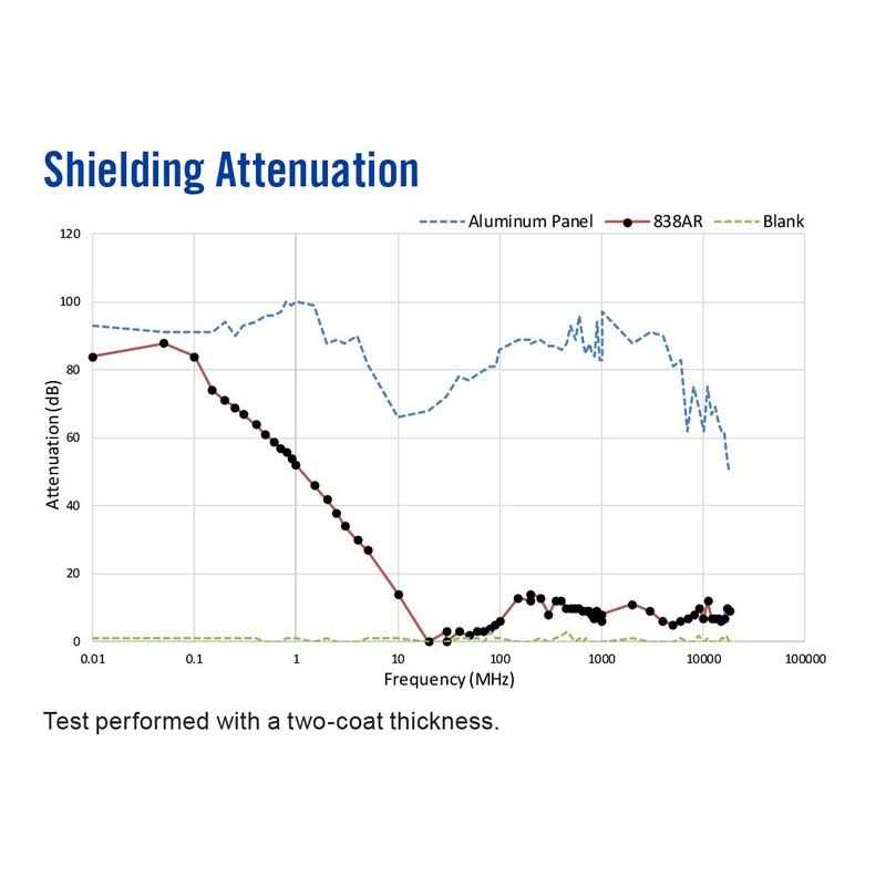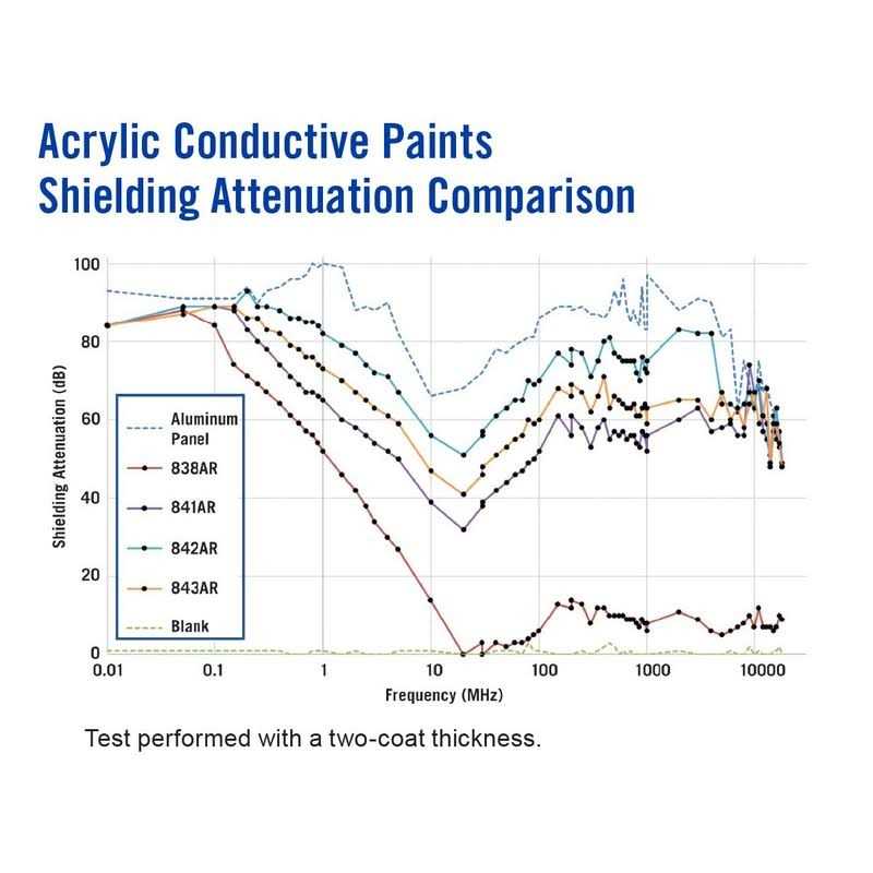 Coatings by MG Chemicals. Details:838AR is an economical conductive paint that consists of a 1-part, solvent-based acrylic lacquer, pigmented with highly conductive carbon powder. It is smooth, durable, and abrasion resistant. It can be easily applied by brush or spray. It has a quick dry time, with no heat cure necessary. It adheres strongly to most injection-molded plastics, such as ABS, PBT and PVA. It provides strong corrosion resistance and is suitable for use in marine environments. 838AR is excellent for creating grounded surfaces and in low frequency RFI shielding applications, such as pickup cavities on electric guitars. It is also perfect for shielding metal detectors and other devices where a metal-filled conductive paint would cause malfunction.
