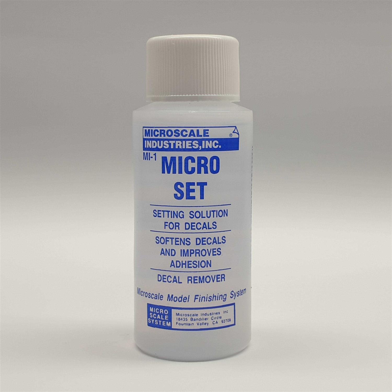 Microscale 104 Micro Set Decal Setting solution/remover – 1oz Micro Set is a very versatile decal setting solution that does several things to Microscale Decals to improve application. Micro Set should be applied to the surface of the model where you will be sliding the decal off the paper backing. Micro Set prepares the surface with special wetting agents that cut the oils in new paint and converts the adhesive on the back of the decal to a stronger and longer lasting one. In addition, Micro Set slightly softens the decal film to make it more flexible so that it will conform better to the model’s surface. Better adhesion of the decal to the model prevents tiny air bubbles from forming and results in an invisible carrier film for the so-called “painted on look.” To apply Micro Set: Use a soft flat artist’s brush and apply Micro Set where you are going to apply the decal. Then slide the decal off the backing paper using a small pointed tip synthetic bristle brush to carefully position the decal in its proper position. Blot the decal carefully with a tissue or paper toweling, being careful not to disturb its position. Allow the decal to dry overnight. It will then be ready for a protective coat of Micro Coat Flat, Satin or Gloss.
