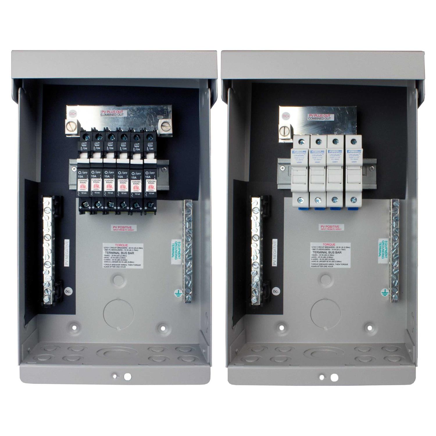 Photo shows MNPV6 with either breakers or fuses. Breakers/fuse holders sold separately. Includes 15 position PV negative bus bar, 14 position ground bus bar, 120 amp Plus bus bar for breakers and 80 amp bus bar for fuses. For 150 VDC charge controllers and 600 VDC grid tie inverters. The most popular PV combiner in North America. Gray aluminum type 3R rainproof enclosure with insulating dead front, will accept six 150VDC breakers or 4 600VDC fuse holders.