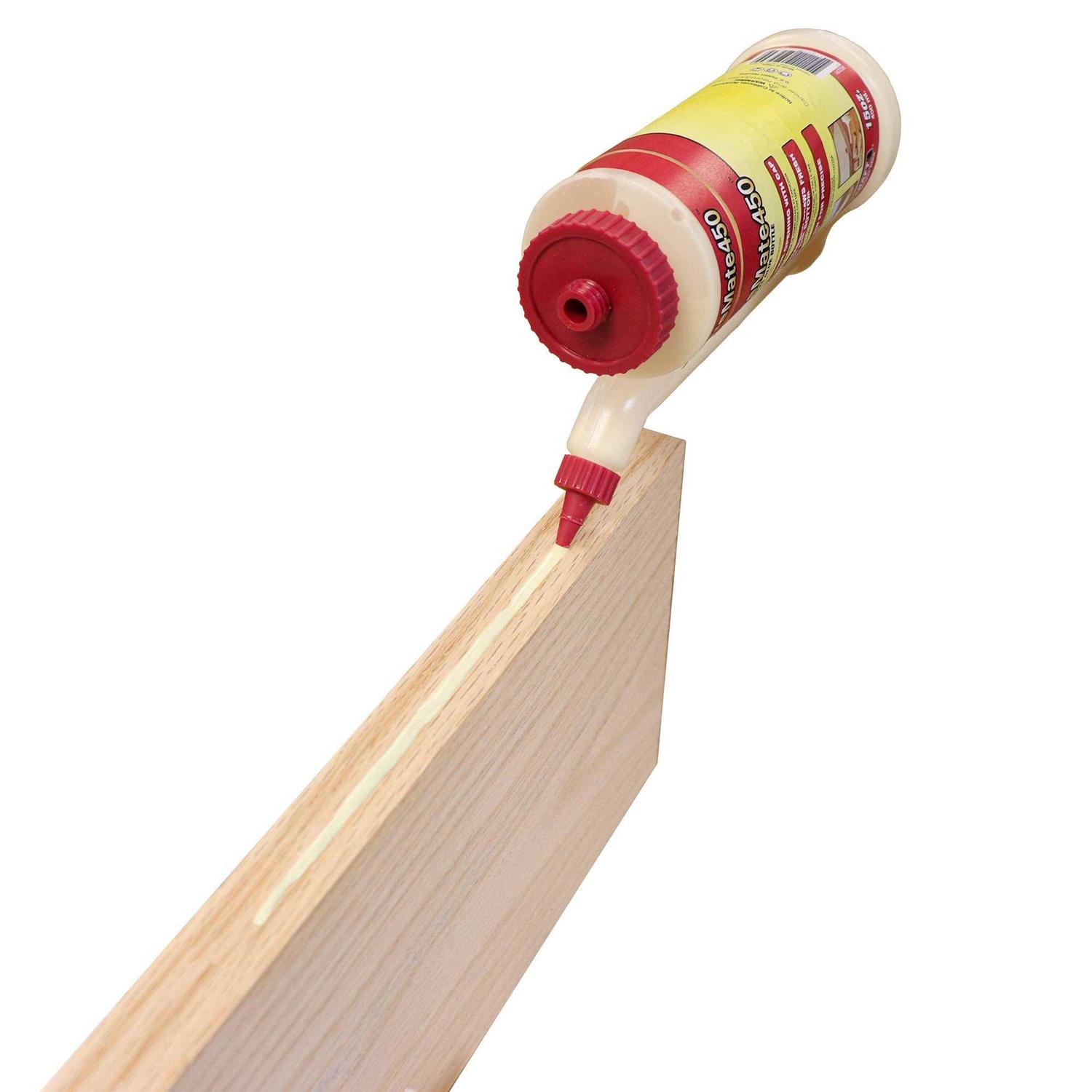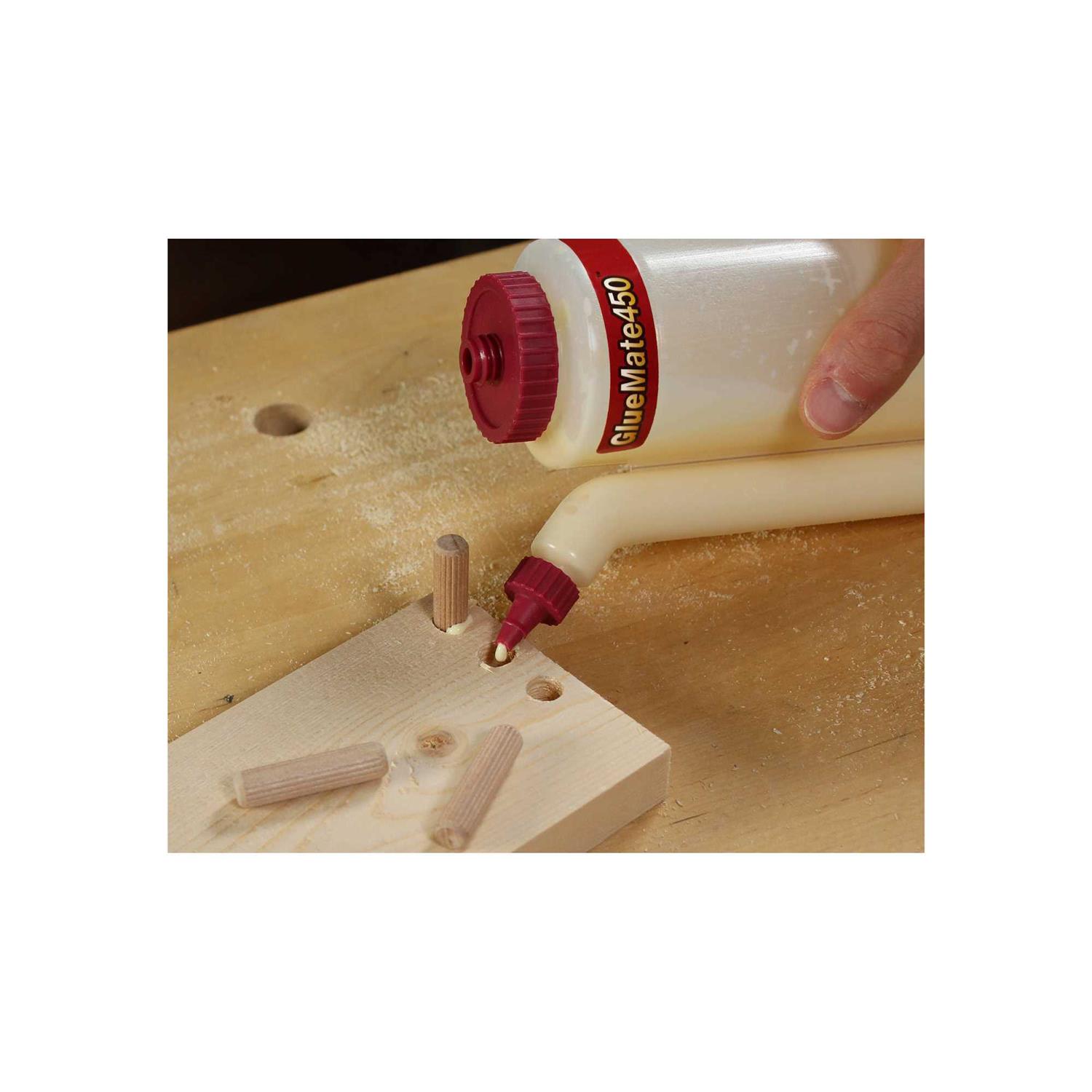 The GlueMate450 by Milescraft is the perfect glue accessory for everyone. From master craftsmen to first-time DIYers, this 15 oz advanced glue bottle makes for quick and accurate application. The large size holds enough glue to be your everyday go-to gluing solution.The secret is the two-chamber design. When pressure is applied the glue is sent from the bottom of the storage chamber up through the smaller application chamber. This allows you to control the flow and deliver just the amount of glue you need. It even allows for vertical application you can put glue anywhere, at any angle! Included with the GlueMate450 are 2 different application tips. A fine point cone applicator allows you to lay down a fine bead of glue on narrow boards or in dowel holes or other joints. The flat biscuit applicator tip has a wide profile making it great for biscuit joints, or just spreading a wider bead of glue on bigger boards.