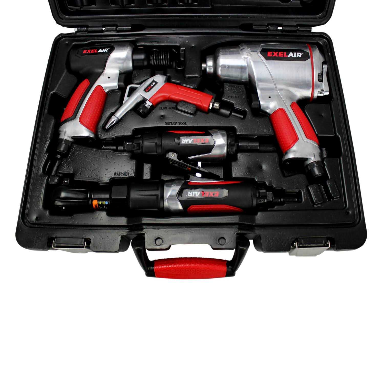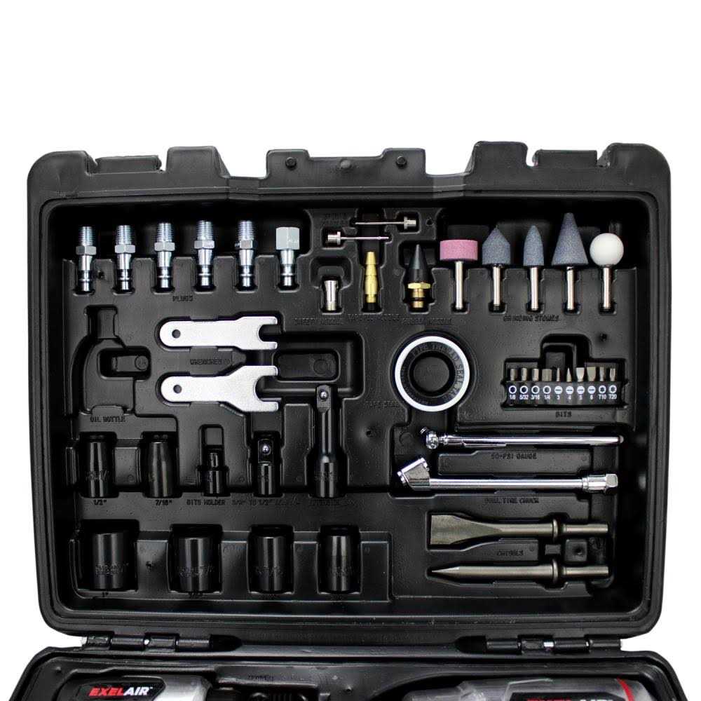 Exelair by Milton, 50 piece Air Compressor Tool Kit is ideal for all automotive, DIY and industrial projects. Each tool is designed with comfortable handle grips for long use. For your safety, the Ratchet Wrench and Die Grinder are equipped with an adjustable exhaust vent. Increase the power of the tool by using Mega-Flow coupler & plugs S-303Vkit. Warning: This product can expose you to chemicals which is [are] known to the State of California to cause cancer and birth defects or other reproductive harm.