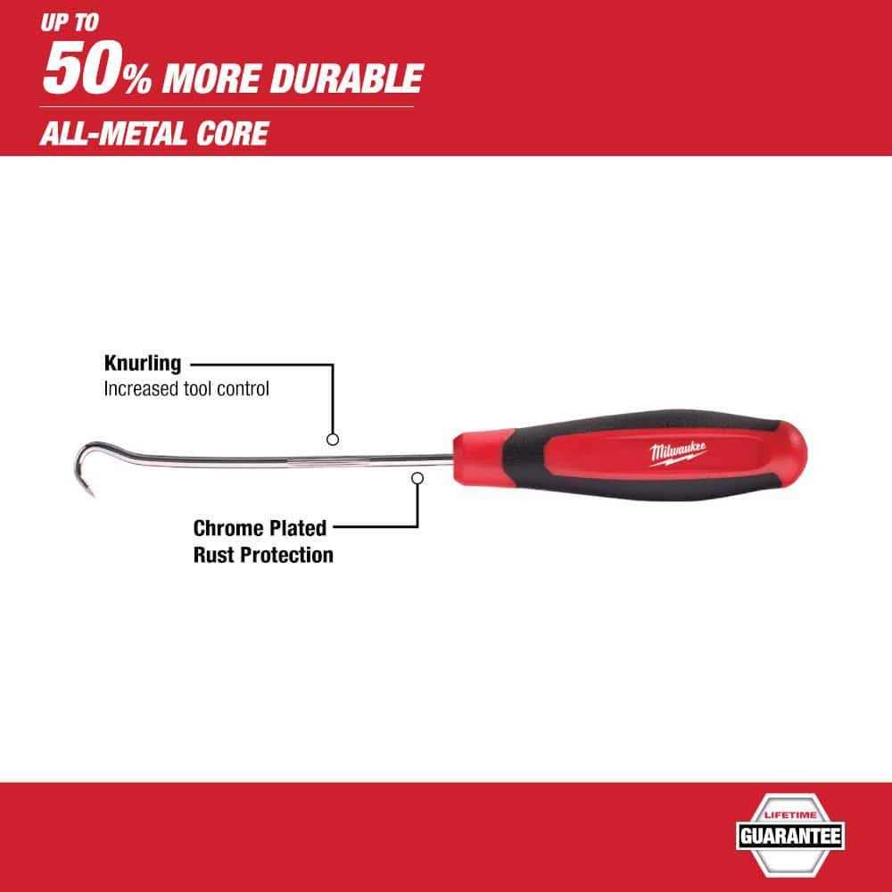 The flex head wrenches have double-stacked pawls within the ratcheting mechanism, which increases durability and extends the life of the tools. The flexible head gives users increased accessibility in difficult-to-reach areas. The MAXBITE Open-End Grip improves the wrench’s grip on nuts and bolts, offering users 25% more torque than smooth-faced wrenches. This flex head wrench set feature ergonomic I-Beam handles designed for improved comfort and ink-filled size labels for easy size identification and quick distinction between SAE and metric sets. Milwaukee combination wrenches feature a lifetime guarantee. The Milwaukee hook and pick set features an all-metal core for up to 50% more durability. Chrome-plated shanks reduce corrosion and provide superior rust protection. A comfort grip handle and precision knurling increase tool control and user comfort. Finally, the kit comes in an easy-access storage tray for long-term tool storage.