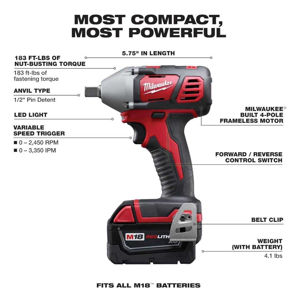 The Milwaukee 2659-22 M18 cordless 1/2″ compact impact wrench is the most powerful 1/2″ compact impact wrench in its class and offers the best power to size ratio among like competitors. Featuring a Milwaukee built 4-Pole frameless motor and optimized impact mechanism, this impact driver delivers up to 2,450 RPM, 3,350 IPM and 183 ft-lbs of fastening torque for class-leading performance. Redlink intelligence provides optimized performance and overload protection using total system communication between tool, battery and charger. The M18 cordless 1/2″ compact impact wrench features a 1/2″ pin-detent anvil for maximum socket retention, an LED Light to illuminate work surfaces, and includes an all-metal, reversible belt clip for temporary tool storage. The Redlithium battery pack delivers more work per charge and more work over pack life than the competitors. The kit includes two M18 XC Redlithium batteries, an M18 and M12 multi-voltage charger, and a carrying case.