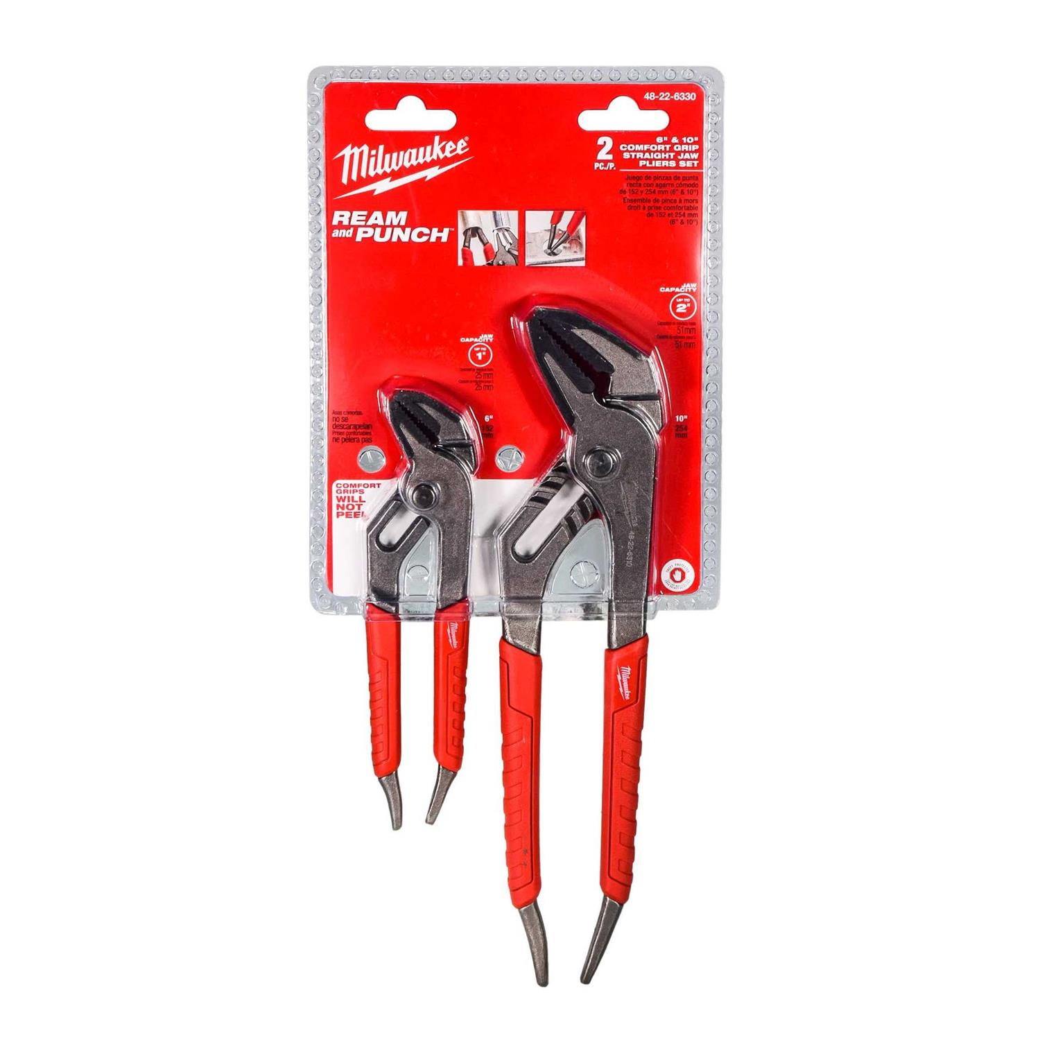 Hold or turn nuts, grip objects of almost any shape and clamp materials with the Milwaukee 6-Inch and 10-Inch Straight Jaw Pliers Set. These pliers feature REAM and PUNCH exposed metal handles that let you punch electrical knockouts and even deburr smooth pipe before installing it. For strength and durability, the Milwaukee 6-inch and 10-inch straight jaw pliers set features rust-resistant forged steel construction. It has hardened teeth as well, which help extend the tool’s life and provide a better grip force. The jaw is versatile, working on both 1-inch and 2-inch round pipes. Made to withstand even tough job site environments, the Milwaukee tongue and groove pliers have non-peel grips. The handle grips are comfortable and made for improved user comfort during extended use.