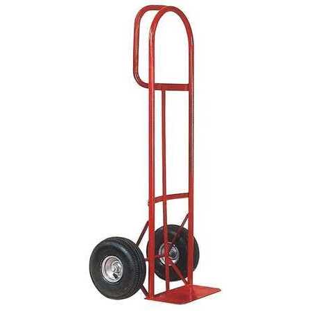 The D-handle allows for one hand operation of the truck. 10″ pneumatic tires help cushion the load and allows the truck to roll over uneven surfaces. 50″ height is great for high stacking applications. Axle support frame and toe plate are welded together for added strength at major stress points. Powder coated finish offers maximum durability. The steel frame is Milwaukee-The Name the Pros Trust.