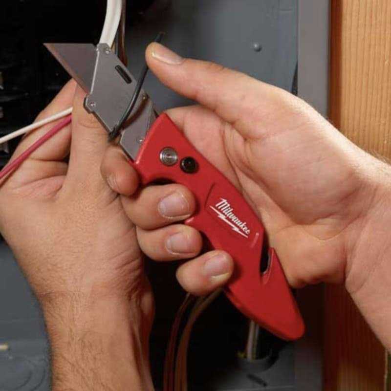 Features a side-activated slide switch to reduce the risk of exposing the blade accidentally. Complete with a red rubber overmold to increase comfort and reduce hand slippage. Also includes on- board blade storage and tool-free blade change to offer less down time in the field. Wire stripper strips up to 12 gauge wire.