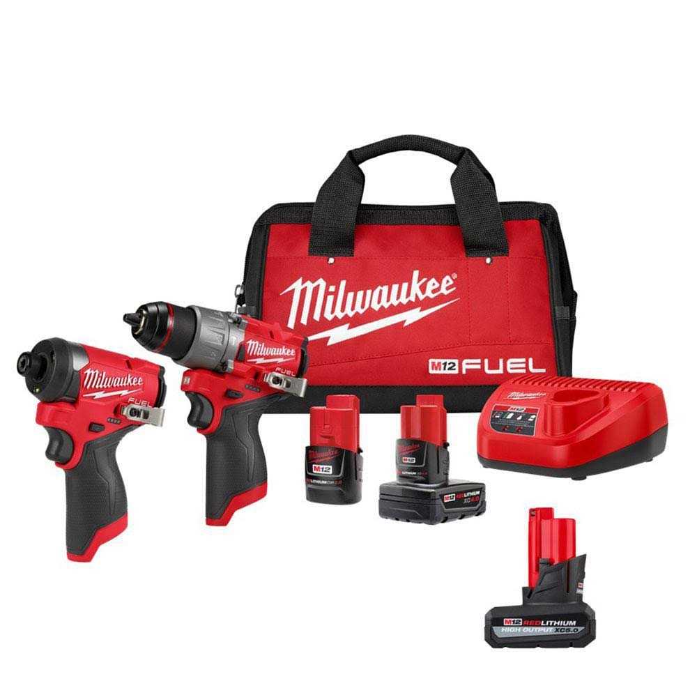 Includes MILWAUKEE M12 FUEL 1/2″ Drill Driver, M12 FUEL 1/4″ Hex Impact Driver, M12 REDLITHIUM XC 4.0Ah Battery Pack, M12 REDLITHIUM CP 2.0Ah Battery Pack, with an M12 charger and a contractor bag. The POWERSTATE brushless motor delivers the most power on the widest variety of applications. The portable drill is the shortest solution in its class offering maneuverability and access to tight spaces. MILWAUKEE REDLINK PLUS Intelligence delivers top of the line thermal performance to give users the Fastest Speed Under Load. MILWAUKEE M12 FUEL 1/4″ Hex Impact Driver is the Fastest Subcompact Impact Driver, the Most Compact, and provides Maximum Workspace Visibility. At 5″ long and 7.6″ tall (with M12 CP 2.0 Ah battery), this solution is the most overall compact impact driver in its class. Tri-LEDs surround the bit accessory with brighter lights and fewer shadows providing maximum visibility. Our M12 REDLITHIUM HIGH OUTPUT XC5.0 delivers 25% more power and runs 25% cooler vs our other M12 REDLITHIUM XC battery packs. The M12 FUEL Impact Driver and M12 FUEL 1/2″ Drill Driver are part of MILWAUKEE M12 System which is fully compatible with over 125 solutions.
