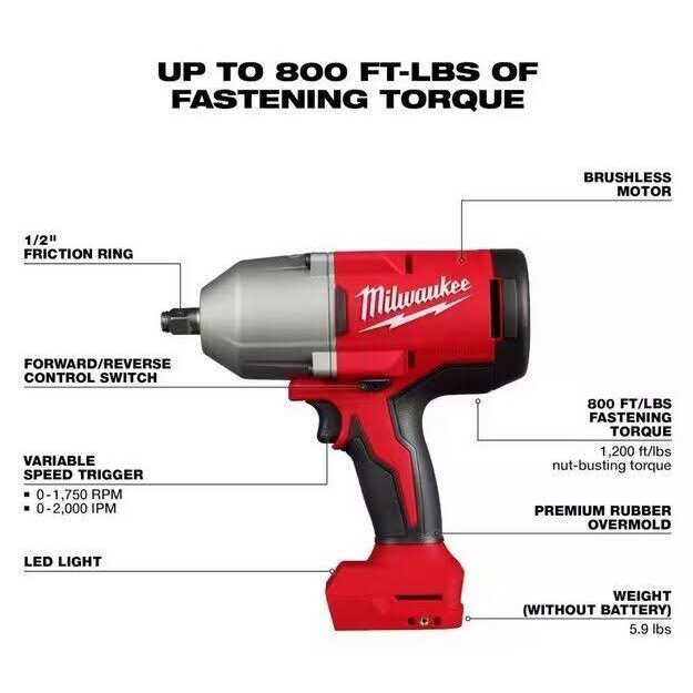 The 2767 M18 1/2″ High Torque Impact Wrench with Friction Ring eliminates the need to use a pneumatic tool for those stubborn and rusted bolts by delivering 1,000 ft-lbs of fastening torque and 1400 ft-lbs of nut-busting torque. With 2X faster removal speed, users will be able to get the job done faster and be more productive throughout their day. By providing the industry’s most compact cordless High Torque Impact Wrench at 8.39” in length, this tool allows for more access in tight spaces. 4-Mode DRIVE CONTROL with Bolt Removal mode gives users the most control over their fasteners. Bolt Removal mode gives the user more control when removing fasteners by slowing to 750rpm once the fastener has been busted loose. This tool offers quick, tool-free socket changes with a 1/2 in. friction ring anvil. A premium rubber overmold material gives you ultimate comfort during prolonged use while lasting longer against corrosive materials.