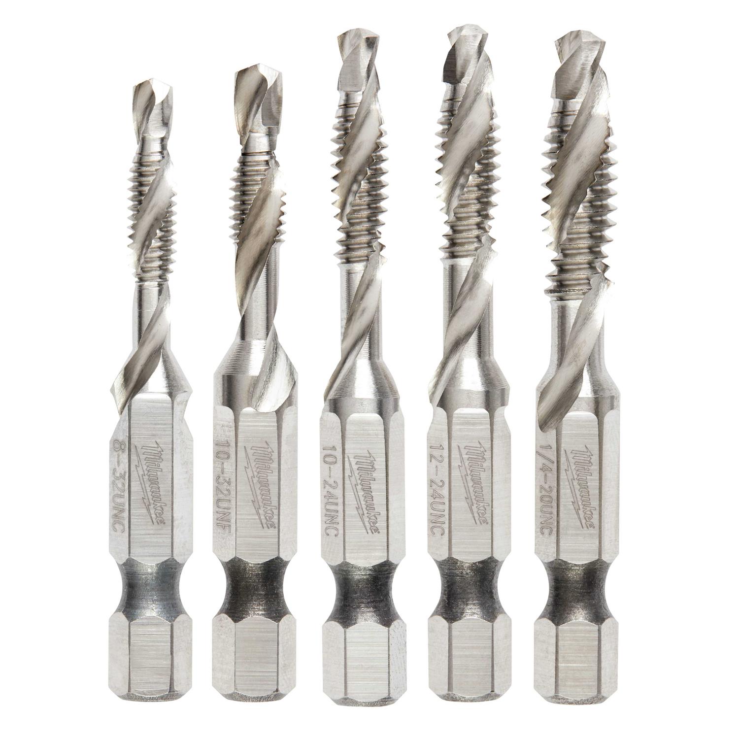 The Milwaukee Shockwave 5PC SAE Impact Drill Tap Set drills and taps at the same time. The bits are intended for use in up to 1/4 in. metal. The laser etched size allows for easy size identification. The bit is design for use in Impact Drivers & Drill Drivers.