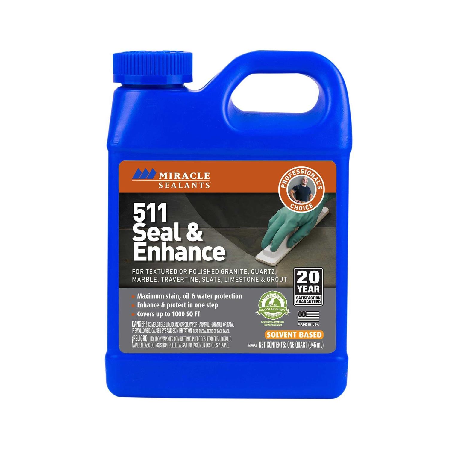 Miracle sealants 511, qt, seal & enhancer, unique solvent base formula, eliminates the need to use an impregnator before using a color enhancer for maximum stain protection & superior color enhancement, for use on granite, marble, limestone, natural stone, slate, ceramic tile, quarry tile & grout surfaces, revitalizes old & worn stone & tile installations, can be used successfully in both interior & exterior environments & is freeze thaw resistant.