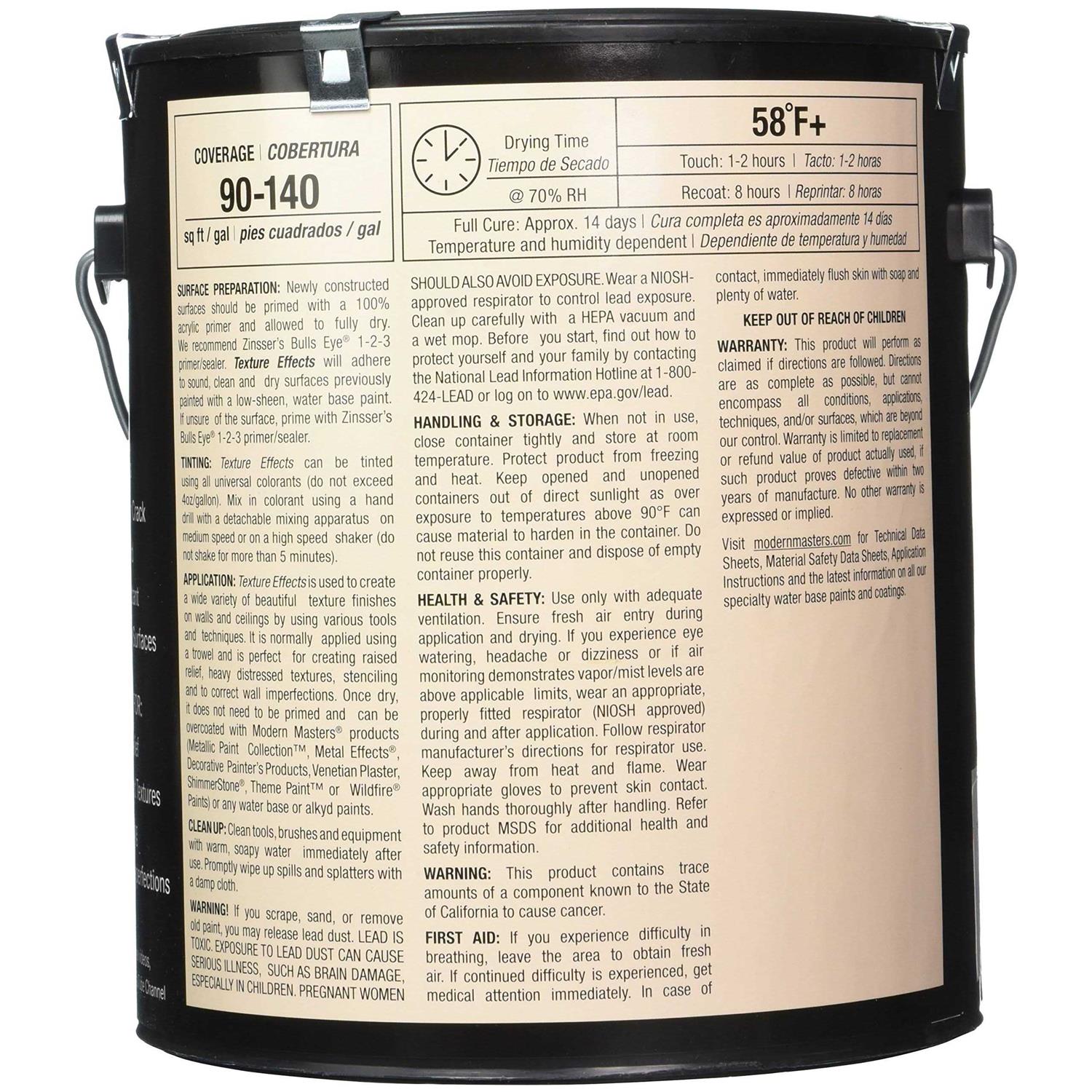 A multi-purpose, water based, acrylic, plaster-like medium that is ideal for raised relief, heavy distressed textures, stenciling, and for correcting wall imperfections. It is highly durable, water resistant, and will adhere to most surfaces. Texture effects will not shrink or crack while drying, and once cured, is hard. This versatile product can be tinted using modern master’s shimmer stone color concentrates, skimstone colorpaks, or universal colorants and exhibits no color loss once dry. This eliminates the need for over painting. One of the most unique and time saving features of this product is the ability to self-seal. This gives the decorative painter the option of glazing or painting the textured surface directly, without the added time and expense of priming or varnishing. Texture effects is water-based and non-hazardous. It contains no lead, mercury, or other toxic ingredients. The absence of harmful solvents makes modern masters texture effects easy and safe to use.Features Capacity – 1 gallon.