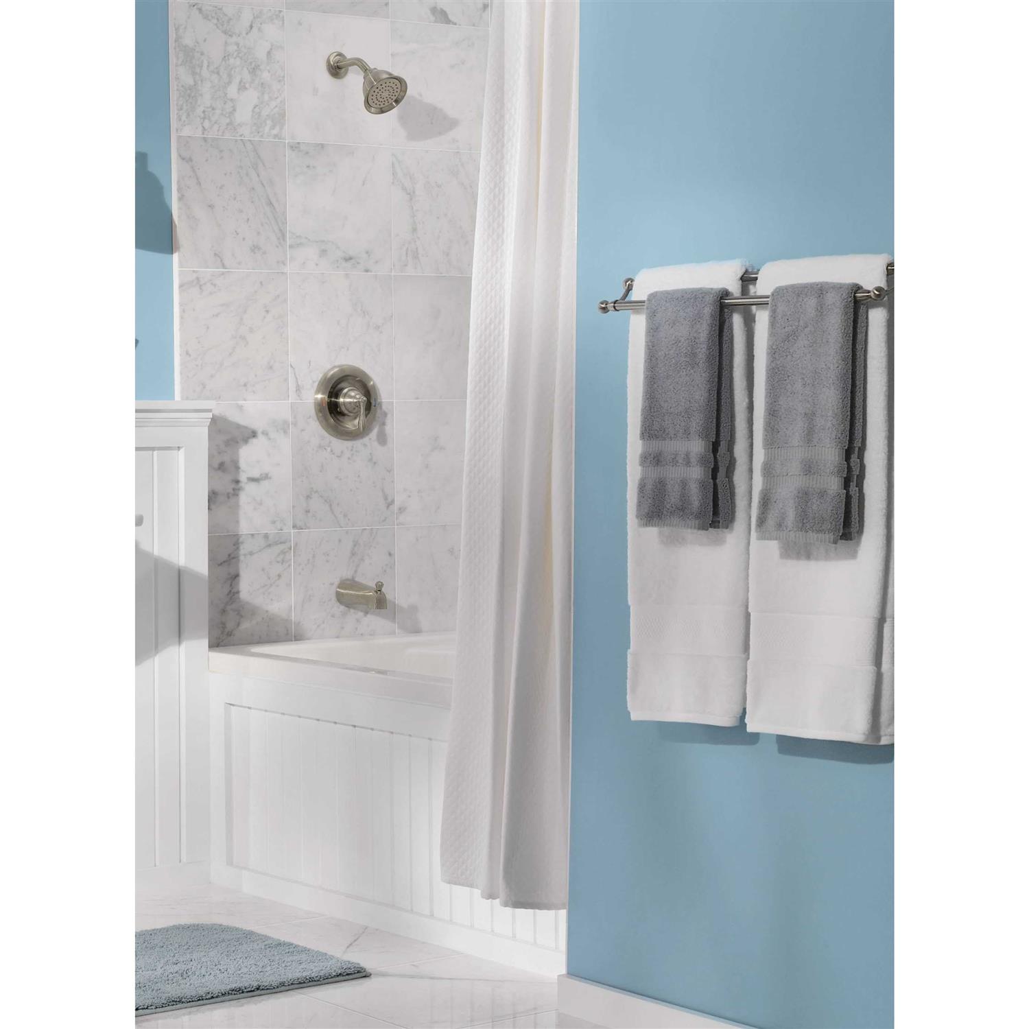 Moen Caldwell Collection offers homeowners classic styling with soft curves and rich details. Spot resist brushed nickel finish resists fingerprints and water spots for a cleaner looking bath. Lever handles make it easy to adjust the water. Equipped with the PosiTemp pressure–balancing control valve to help maintain water temperature in the shower. Full spray. 5 1/2 inch tub spout length. Complies with Americans with disabilities act (ADA) specifications. Meets epa WaterSense criteria to conserve water without sacrificing performance.