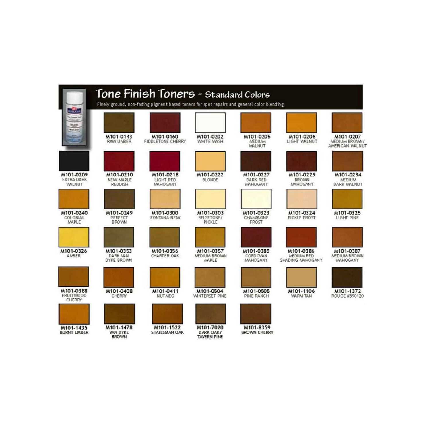 Mohawk Tone Finish Toners are used throughout the industry for quick efficient professional touch-up. Tone Finish Toners contain finely ground, non-fading pigments for color repairs that last. Toners adapt to various methods so as to blend in spot repairs. Adjustment of sheen is achieved with a topcoat of clear lacquers available in gloss, satin, flat and dead flat. Aerosol form, no extra equipment needed. Feathers in invisibly for touch-up repairs. Available in a wide variety of wood finishing shades.