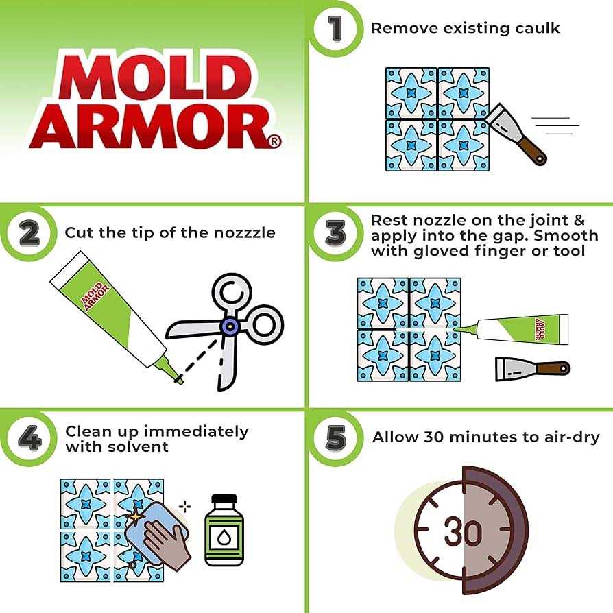 MOLD ARMOR 100% Mold Free Caulk & Sealant (Clear) is a durable mold and mildew-free silicone Flexible, crack-proof formula with excellent adhesion and a clear finish. Use to fill cracks and gaps on interior hard surfaces such as glass, granite, marble, wood, ceramic, metal, aluminum, fiberglass, and painted surfaces. This 100% silicone, mildew-resistant formula works for the shower, tub, kitchen and countertop. A ready-to-use sealant that’s waterproof in 30 minutes – it won’t yellow, shrink or crack.