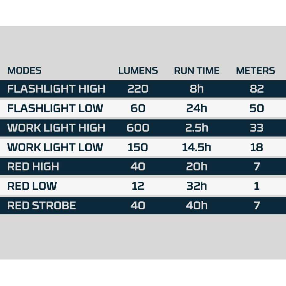 - Output: 220 to 60 lumens flashlight; 600 to 150 lumens work light; 40 to 23 lumens red