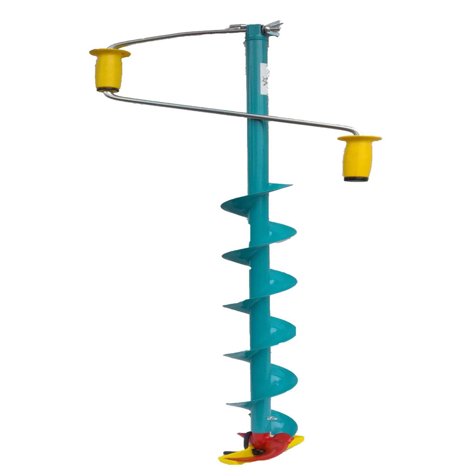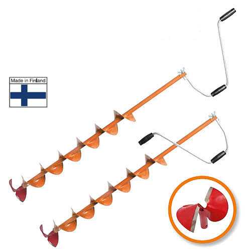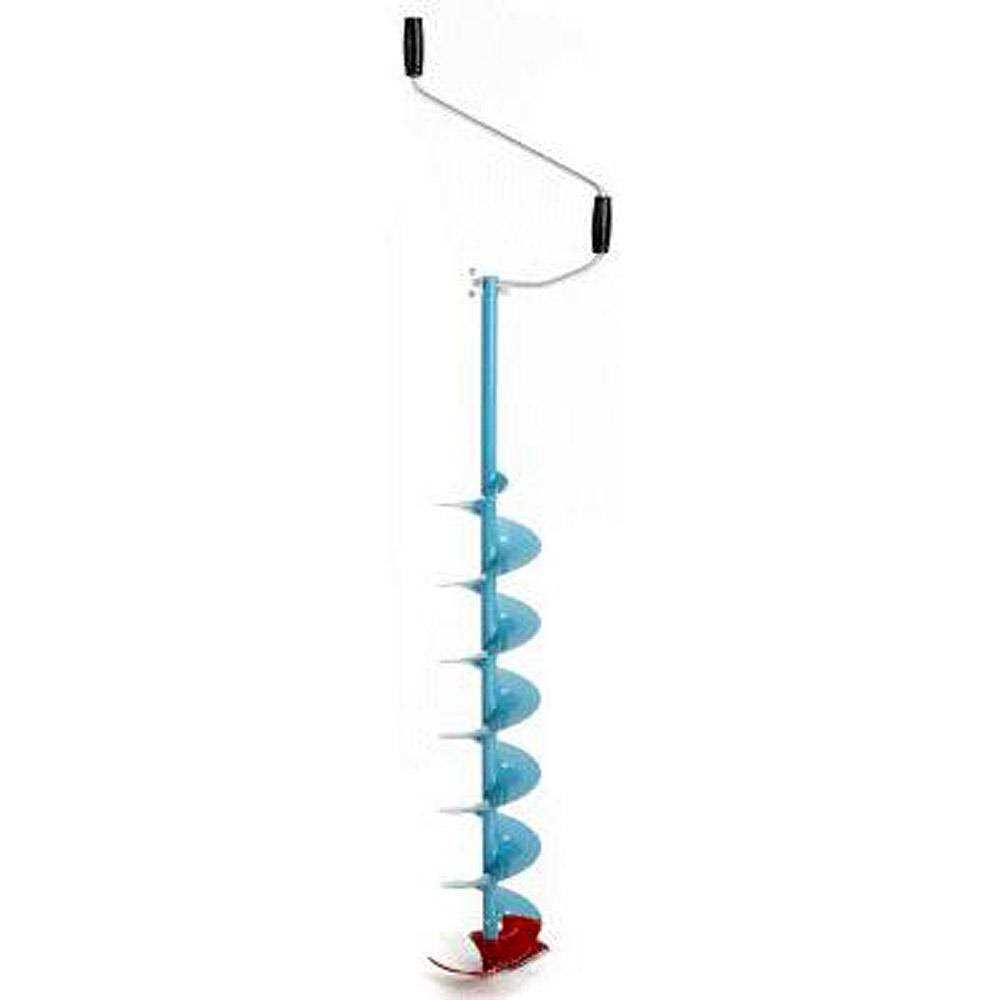 Nils USA Hand Augers feature a one piece cutting head instead of individual blades. This design offers a stronger over all cutting surface. The cutting head is constructed of high chromium steel, which is more durable than other brands of auger blades and will stay sharper much longer. The curved blades quickly cut through the thickest ice with little to no downward pressure applied. These augers do all the work. The Nils USA Hand Augers have cushion grip handles for cutting comfort. The offset handle design brings the drilling hand out, farther away from the center line of the auger increasing the torque going directly to the cutting head. This makes drilling holes much easier than with similar sized augers. The folding handle design makes transportation and storage a breeze. All models come with a plastic cutting head cover to protect the blades from damage and to protect users from the blades. These augers are power-coated blue with red cutting heads. Please note that the auger assembly/cutting head section of these hand augers can be used in conjunction with the Nils USA power auger powerheads.
