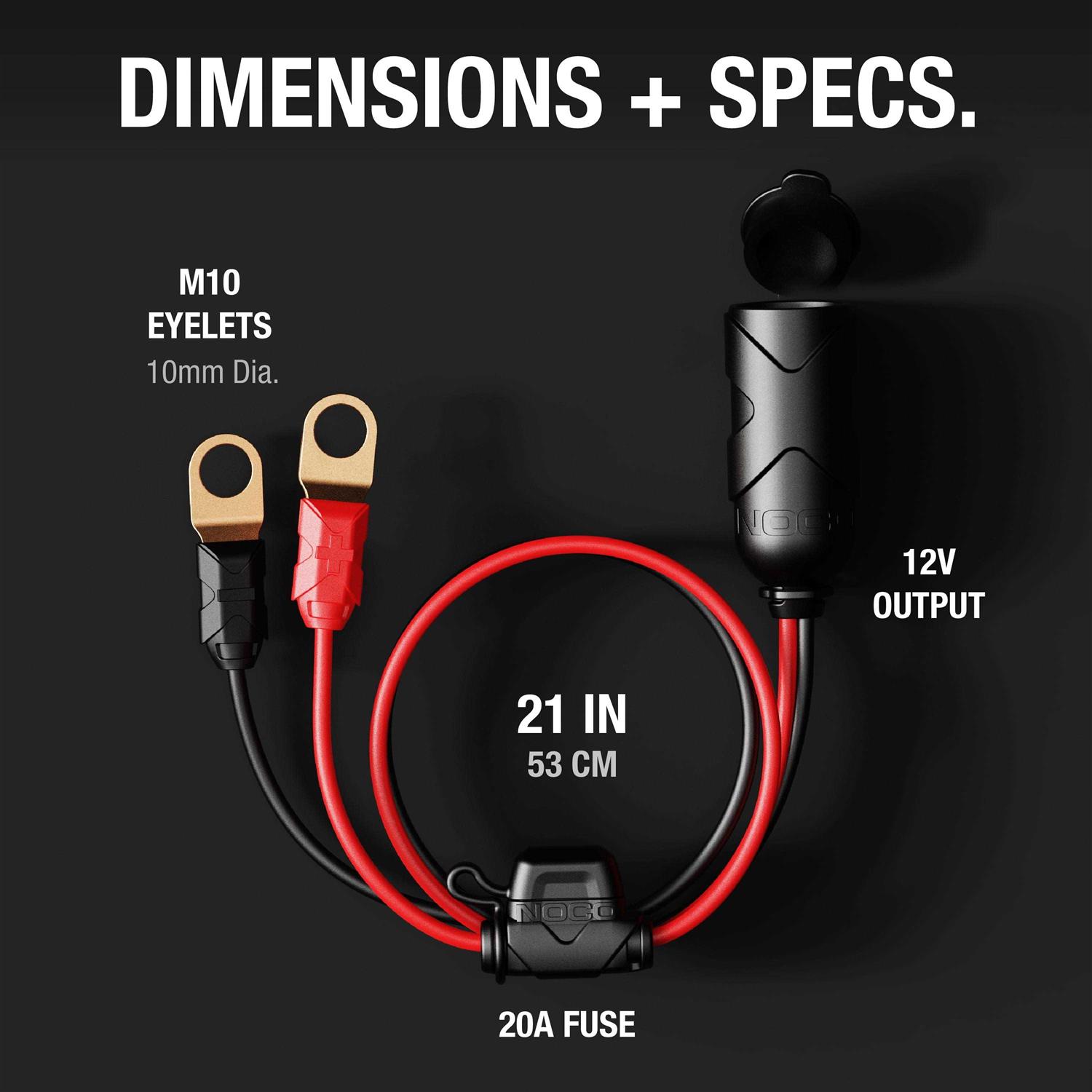 The NOCO 12-volt plug socket connects directly to your battery with integrated eyelet terminals. It features fused connection, leads to prevent dangerous short circuits and a water-resistant cap to protect the 12-volt female socket from the elements. It’s made from a high-conductivity 100 percent copper wire and has a rated capacity of 15 amperes. Molded strain reliefs provide additional support against unwanted tension on the wire connections. It’s perfect for your favorite 12-volt devices, like a tire inflator, vacuum, coffee maker and more.