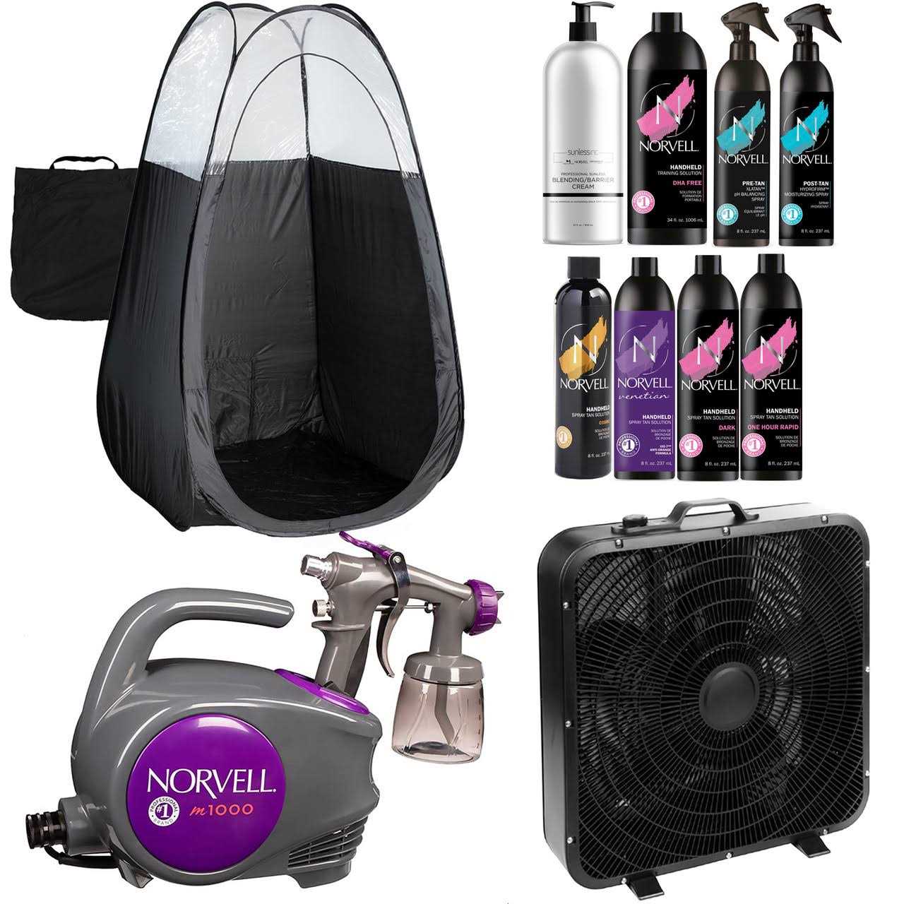 Norvell Sunless Kit M1000 Mobile Hvlp Spray Tan Airbrush Machine + 8 Oz Tanning Solutions In Ultra Vivid ‘Cosmo’, Venetian and Dark + Norvell
