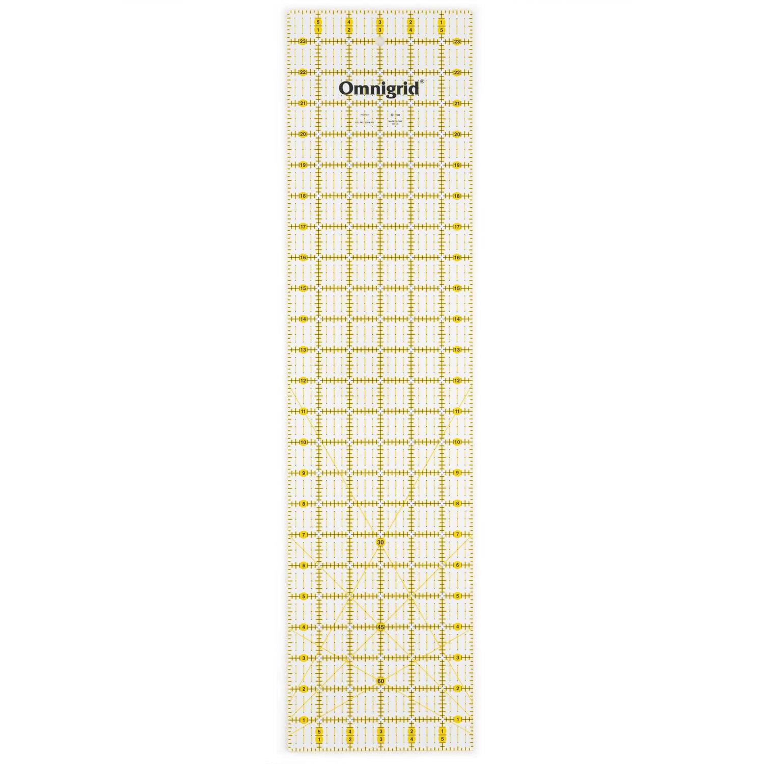 Omnigrid Rulers are made from a durable, premium quality acrylic plastic and laser cut for a smooth edge that allows for easier, deeper cutting of fabric layers. The patented double line effect is printed in black and yellow which allows the user to see the grid on both dark and light fabrics. Designed for left and right handed users. 6 x 24 inch ruler is primarily used for cutting long strips and multiple angle pieces for the beginning and advanced quilter. This ruler has 30 degree, 45 degree and 60 degree angles lines marked for easy alignment of fabric.