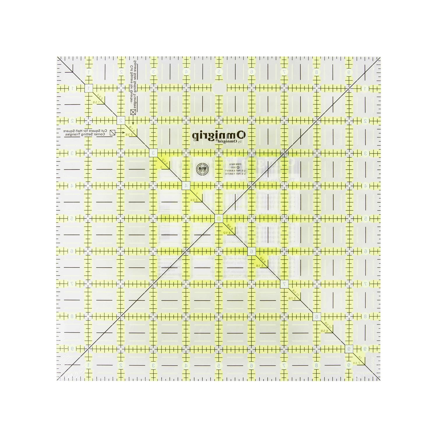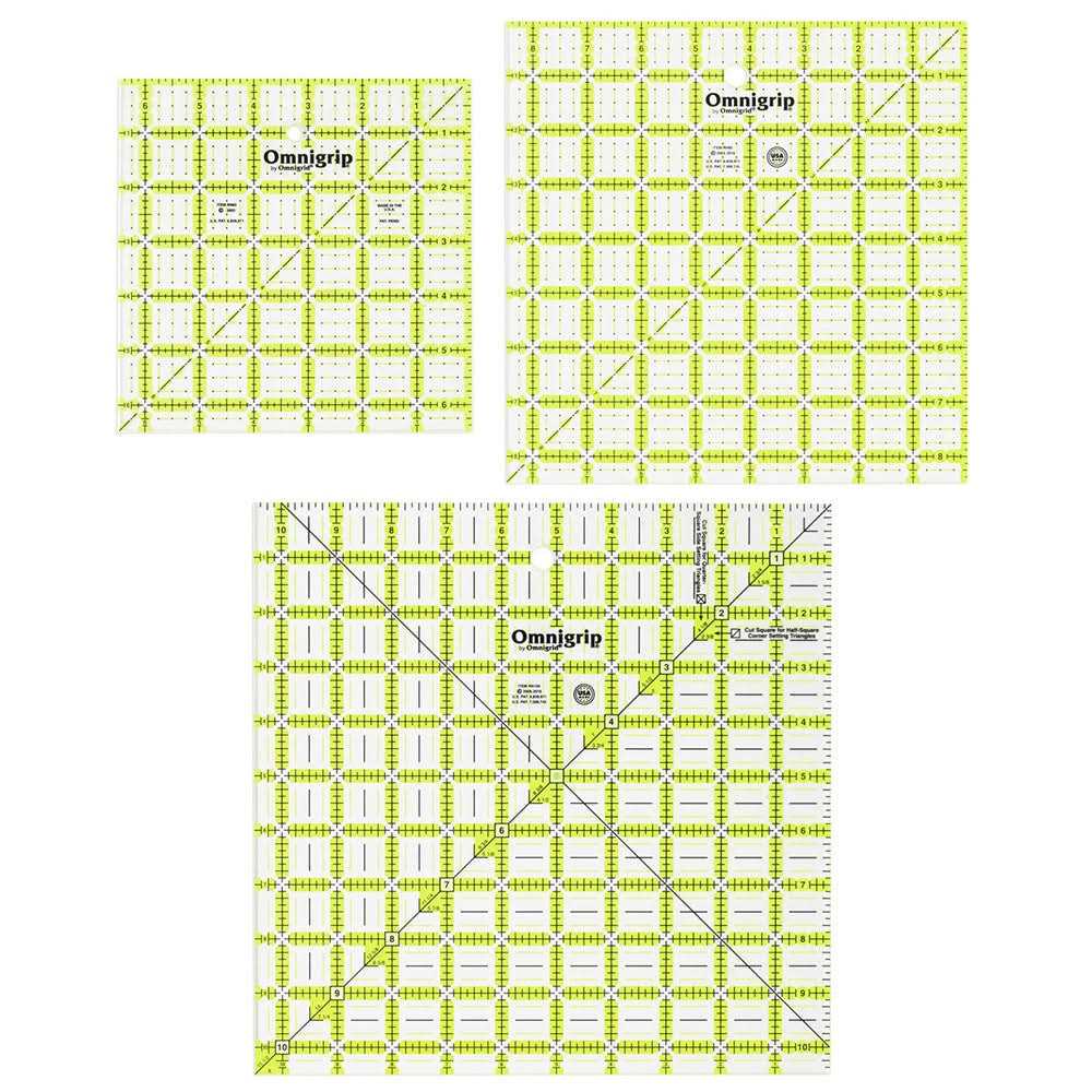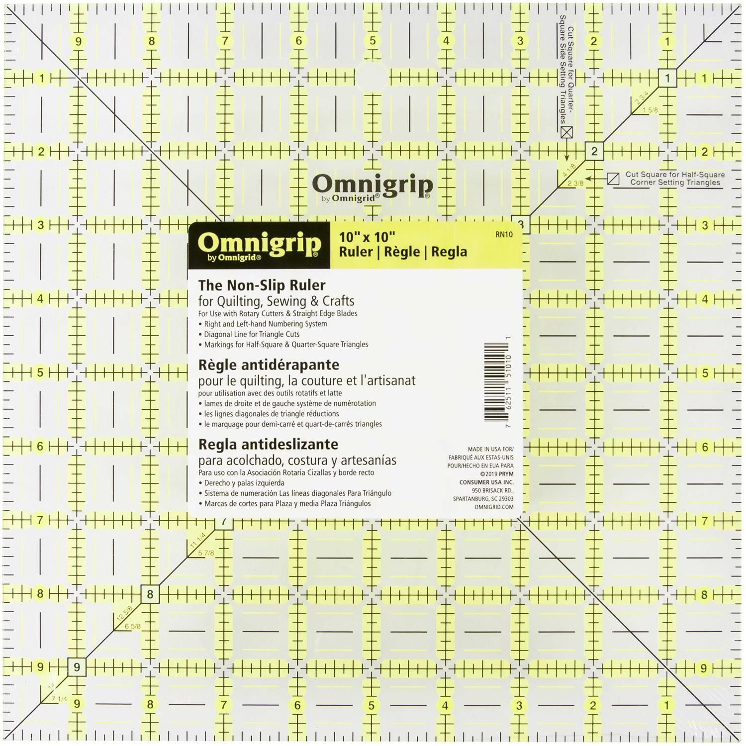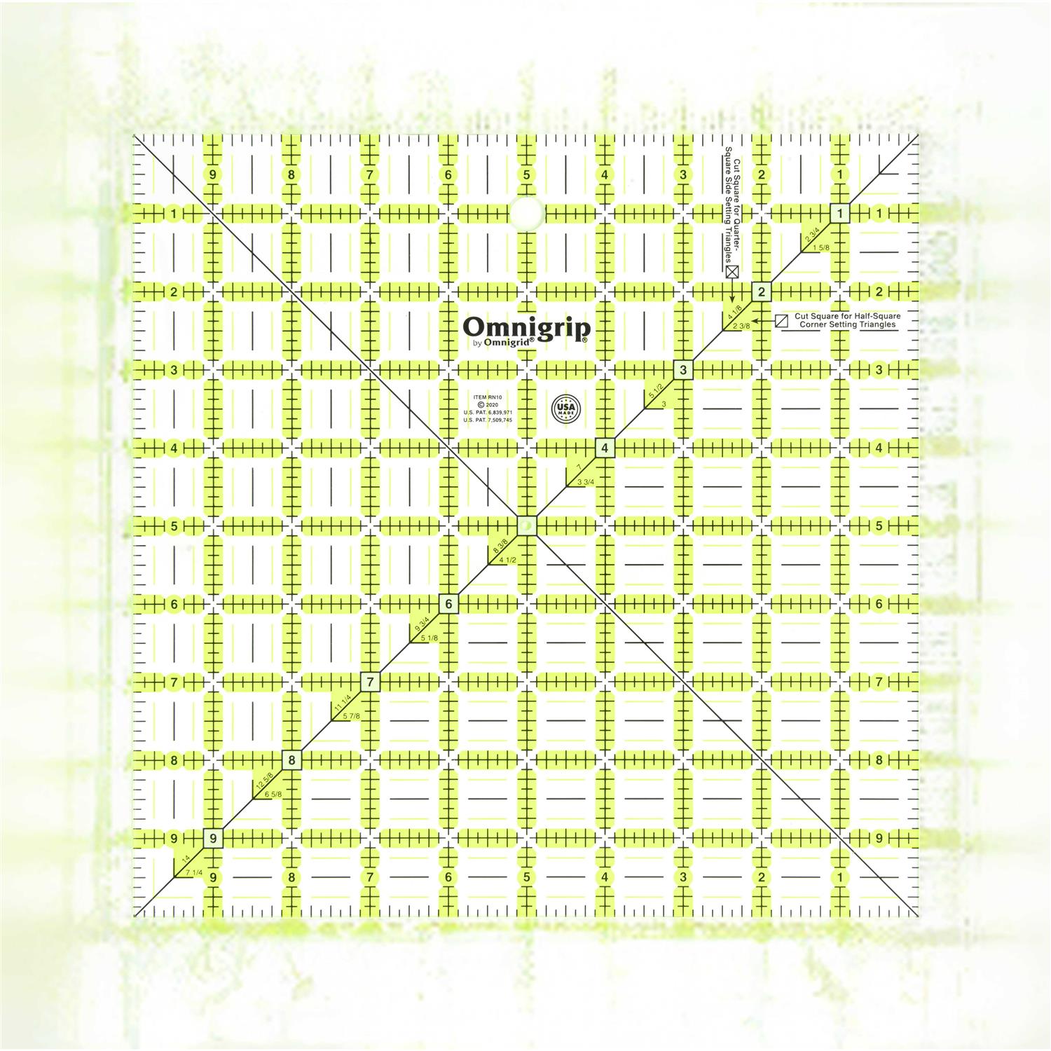 Omnigrip Non-Slip Neon Rulers are made especially for quilting, sewing and crafting projects. Use with rotary cutter or straight edge blades. Made with a unique numbering and angle system, and may be used with either right or left hands. Grid in both Neon Green and Black so that it will be visible on both dark and light colored fabrics. 10 inch Square for cutting, squaring and setting blocks. 45 diagonal lines for triangle cuts, markings for half-squares and quarter-square triangles. Also has an extra 1/2 inch included on 2 sides for quilting seam allowance.