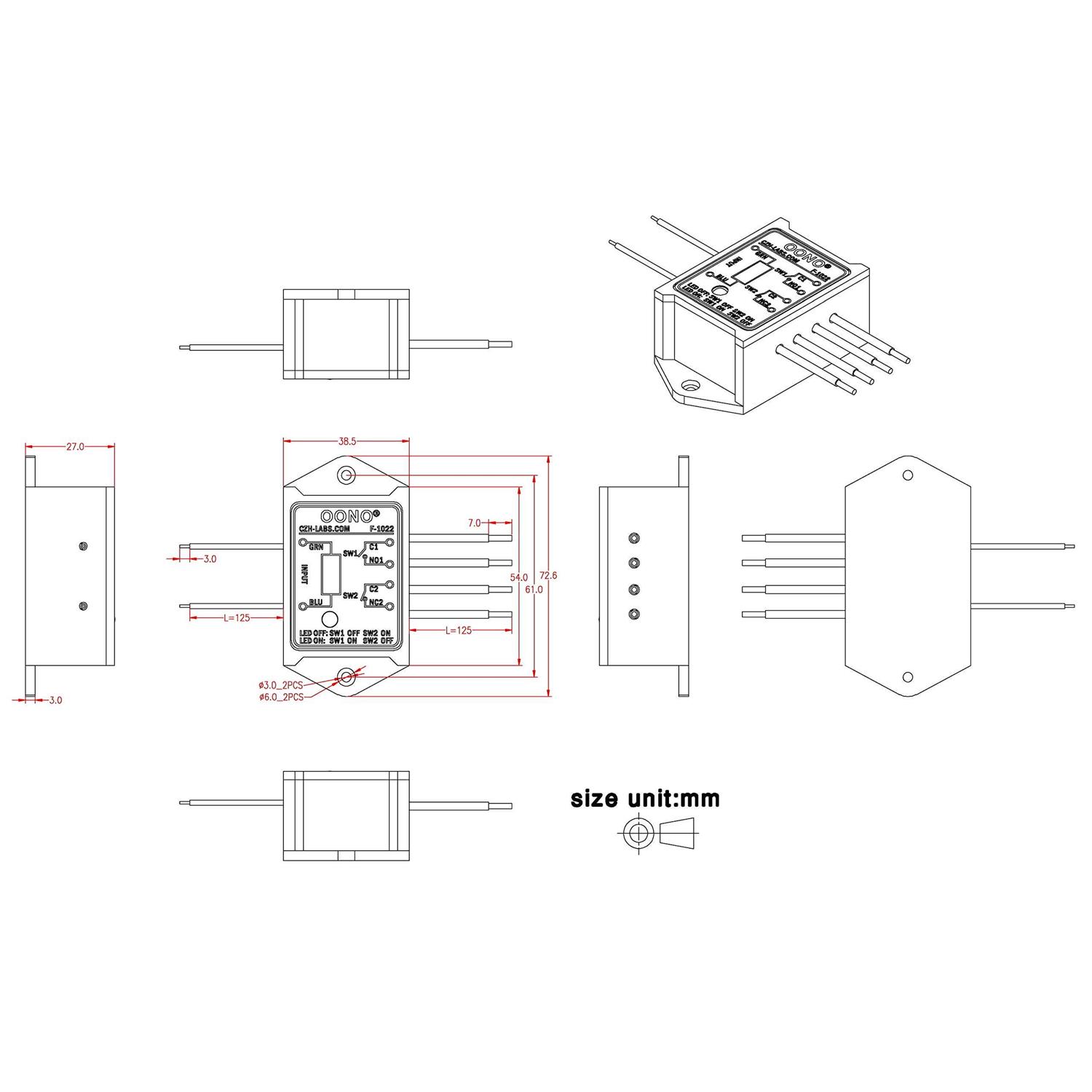 - Compact plastic case and wires connects for easy mount. LED indication for relay action.