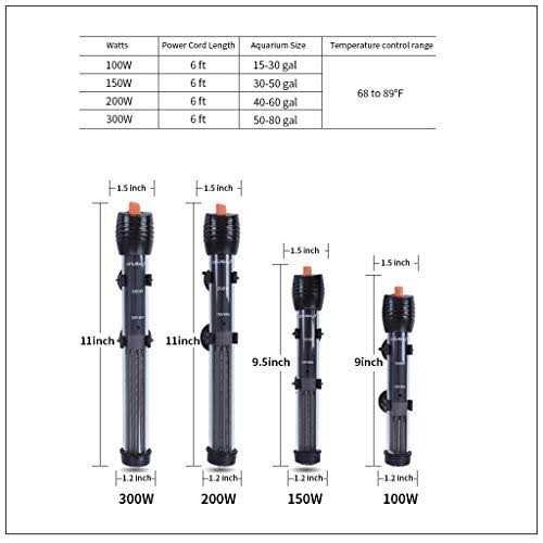 150W aquarium heater is suitable for 20 to 30 gallons aquariums,Length – 9.5″,voltage 110-120V, power cord is 6ft, please choose the right wattage aquarium heater according to our size chart. It shows an area to adjust the temperature. It’s not exactly accurate but it turns easy and can be adjusted at small intervals Explosion Proof: 2mm thickened quartz glass,can be used in fresh water and salt water aquariums,easy to hide in the tank. Precise temperature dial from 68 to 89°F allows for complete control of aquatic climate within a 1-degree difference Adjustable Aquarium Fish Tank Water Heater Sensitive and reliable thermostat maintains uniform temperature. Automatic shut off when the temperature is reached. Product Features: 1. 110V-120V/60HZ 6-foot power cord, 2. Fully submersible. 3. Universal heater for marine, freshwater or tropical aquariums Available In: Length – 9.5″ 15-20 Gallons, 100 Watts Length – 9.5″ 20-40 Gallons, 150 Watts Length – 11″ 30-40 Gallons, 200 Watts Length – 11″ 30-55 Gallons, 300 Watts Submersible Aquarium Heaters are made from thermal shatter-resistant quartz glass and were designed to absorb impacts, making them extremely durable. Can be positioned at a vertical or horizontal angle. Can be used in fresh or saltwater fish tanks. 6-Foot power cord.