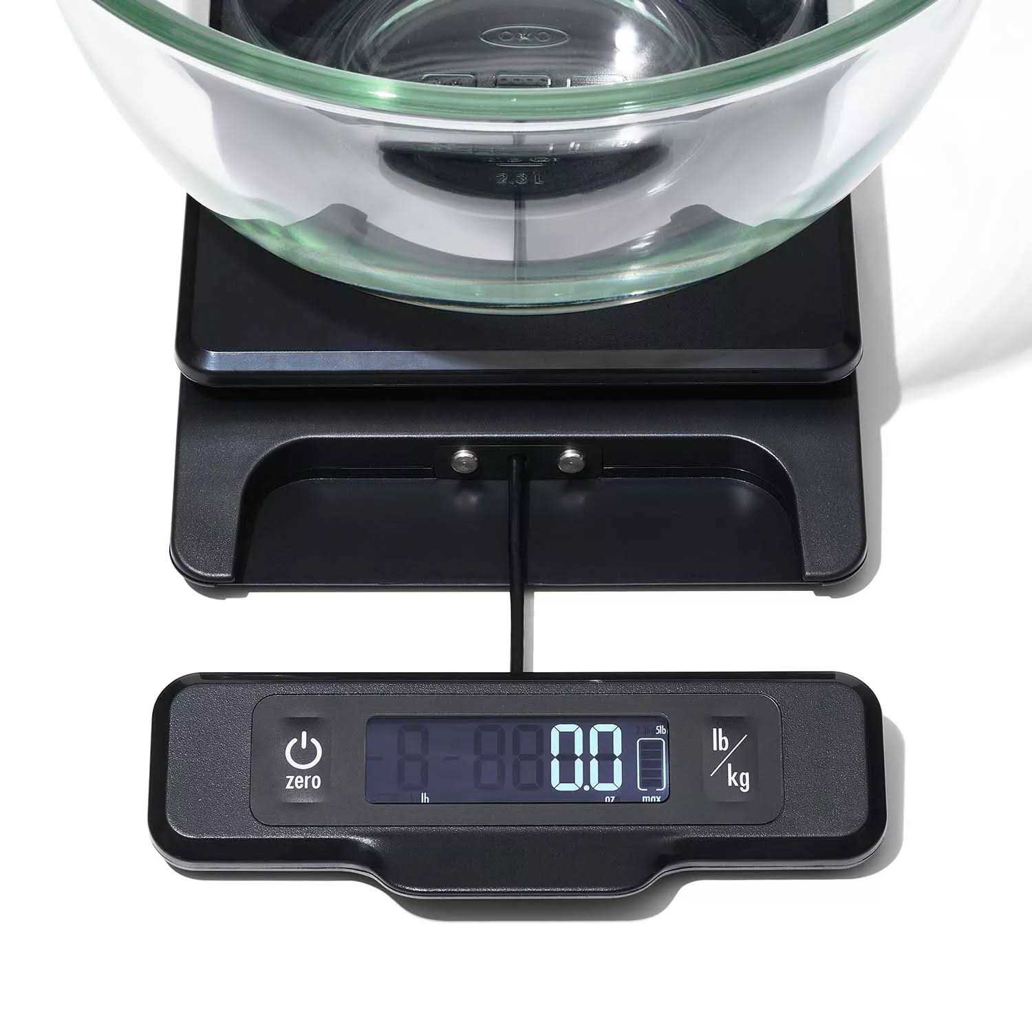 The OXO Good Grips 5-Pound Food Scale with Pull-Out Display is great for weighing meat, produce, herbs, spices and more. The easy-read digital display features large numbers and measures in 1/8-ounce and 1-gram increments. An optional backlight illuminates the display in low-light situations, and a convenient weight indicator shows what remains of the Scale’s 5-lb capacity. The digital display easily pulls away from the base to prevent shadowing from large plates or bowls. Press the Zero button to offset the weight of a container or to reset the weight to zero before adding additional ingredients. The platform removes for quick hand washing and the Scale’s thin profile ensures easy setup, cleanup and storage. Four AAA batteries included.