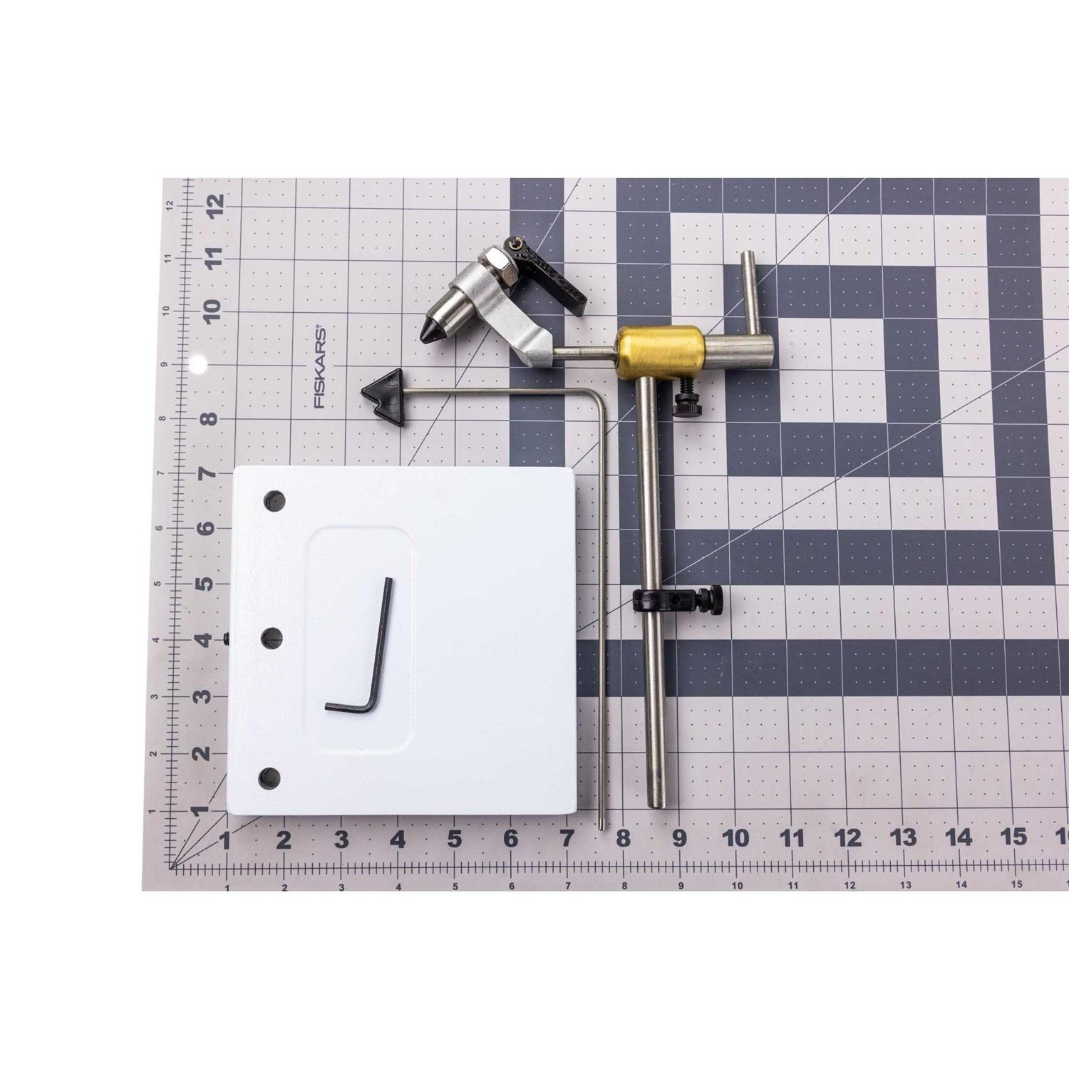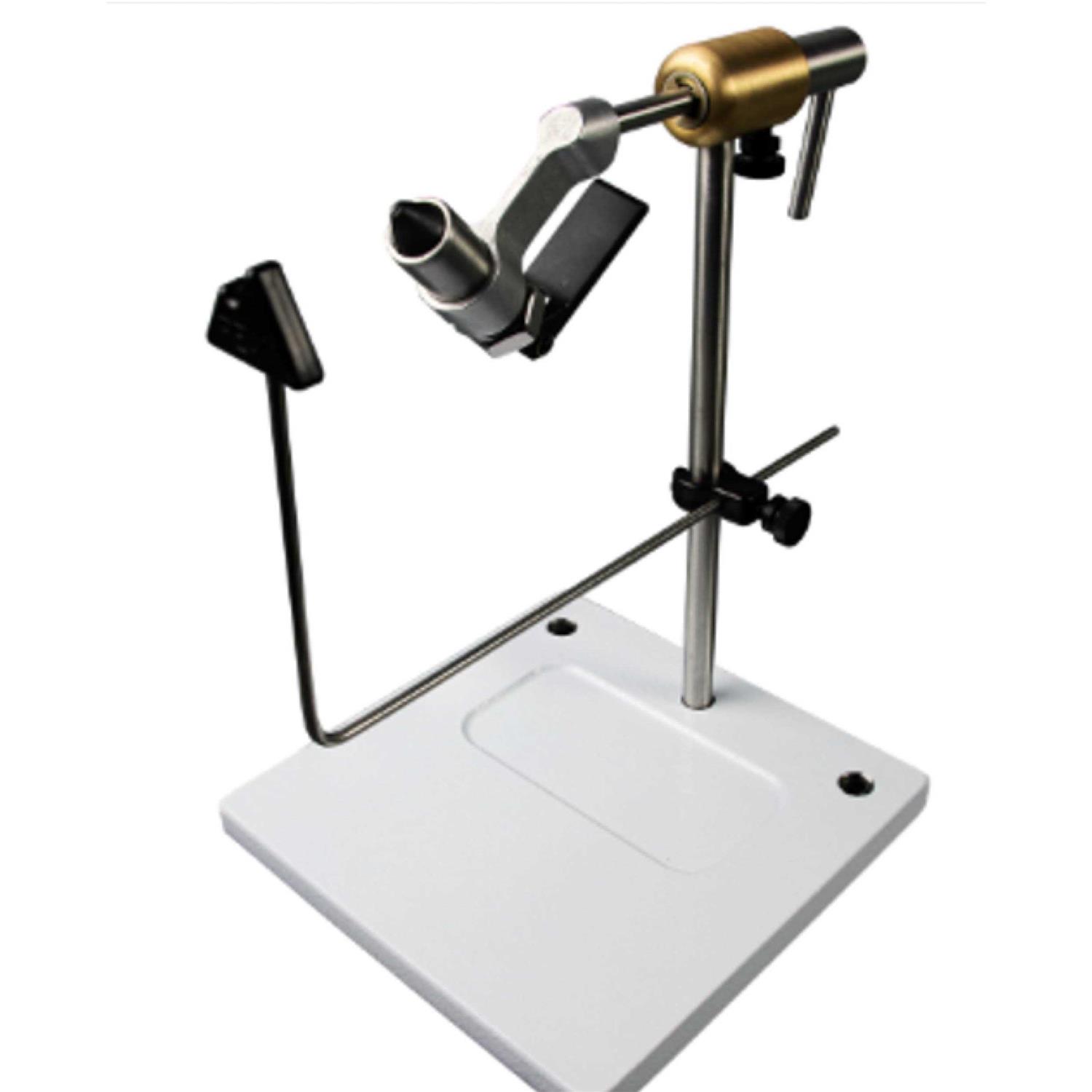 The PEAK Rotary Vise (PRV products) is designed for optimal tying efficiency and ease of adjustment and set-up. Materials (including Stainless Steel, Brass, Tool Steel, and Aircraft Aluminum) are chosen to last a lifetime. Hardened and tempered tool steel jaws hold hooks securely, from size 2/0 (depending on exact hook wire diameter) down to the smallest you can buy. Adjustments are accomplished with minimal effort. The large stable pedestal base will hold this vise where you set it, and the non-marking feet protect the surface you set it on. The steel base is powder coated white for a durable surface that provides a backdrop you can see your materials against. The base also includes an integrated hook/bead pocket with rounded edges for ease of removal, and two accessory post mounting holes (accessory post not included). The base is designed to pack flat for travel with the vise removed. The rotation resistance adjustment screw provides infinite adjustment and is easily manipulated by right or left handed tiers. A height and length adjustable bobbin cradle are supplied with the vise. Loosening a single set screw allows the vise to be removed from the base for travel.