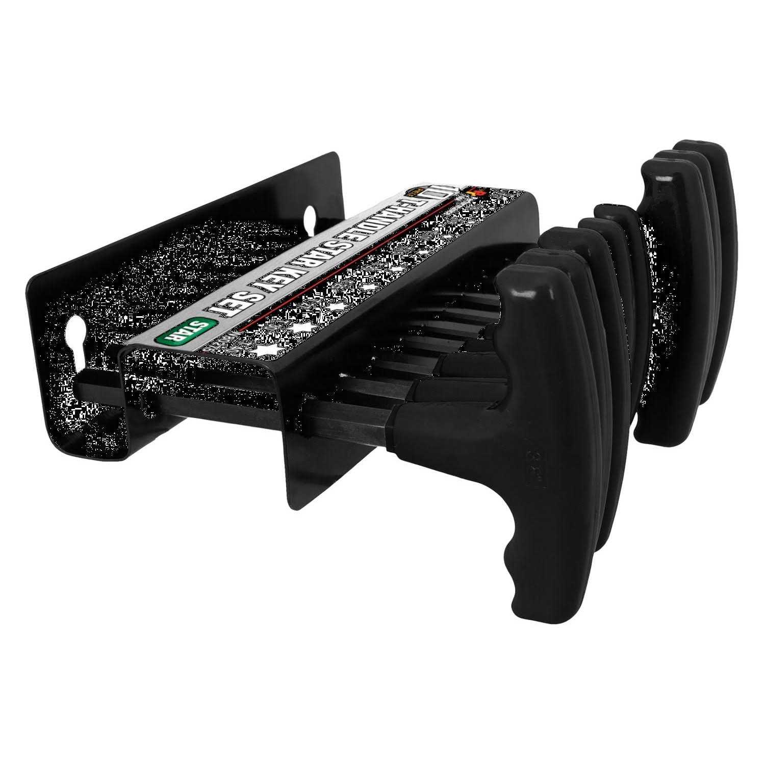 Work smarter not harder with this Performance Tool T-handle Torx star key set. Made from high-quality carbon steel shafts the plastic grips allow you to apply more torque without slipping. A black oxide finish adds corrosion resistance. The handy storage rack keeps the hex keys organized.