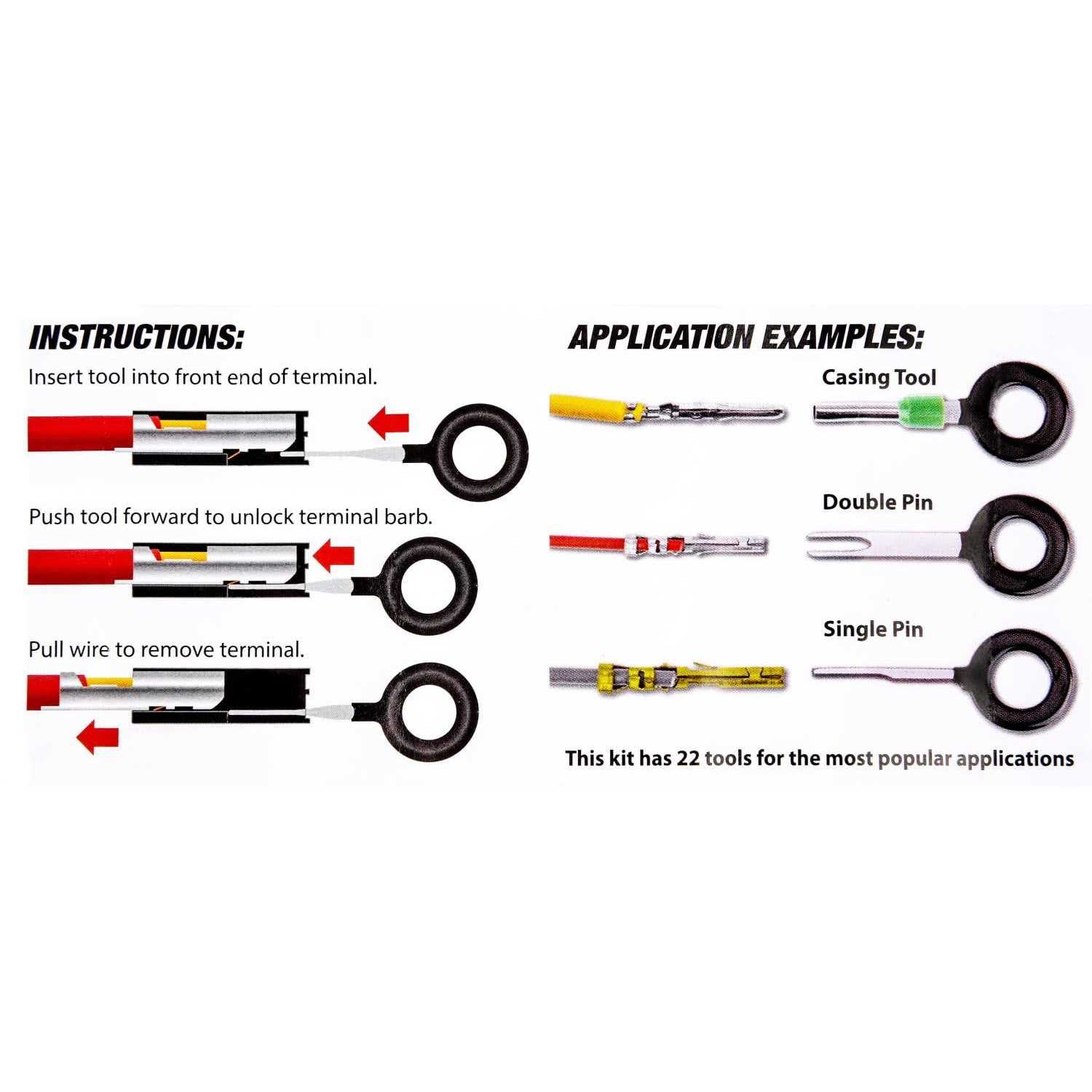 Contains styles and sizes to fit most wiring harnesses and power supply connector plugs. Remove connector pins safely without damaging wiring harness or terminal block. Simply push the tool into the front (connector side) and pull the pink and wire from the back (wire side). All tools are made of flexible 301 stainless steel with round rubber-coated handles. Also includes a compact Delphi Weather Pack style release tool with fully molded easy-grip handle. Sizes include: 7-pc. single pin extractor from .8-2mm, 9-pc. double pin extractor from 2-8mm and 5-pc. casing tool from 2-4.9mm ID. Tools fit inside two-sided flip case with crystal-clear lid so you can easily find the needed bit. Peg hook hanger tab can be pulled out for hanging or pushed flush into the case for compact storage.