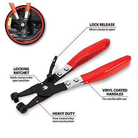 Garage or Workshop Must-Have. Experience efficiency and comfort with our Flat Band Hose Clamp Pliers, designed for both professional and DIY use. These pliers, featuring a sleek black and red color scheme, are engineered with an ergonomic grip, ensuring a comfortable and secure hold during use. Ideal for compressing spring-type hose clamps in tight areas, they are a must-have tool in any garage or workshop. Long-Lasting and Convenient. Our pliers stand out with their locking ratchet action, which holds the clamp open for effortless removal and installation. Built for durability and quality, they promise long-lasting performance. Conveniently portable, these pliers offer universal fitment, making them versatile for various applications. Whether at home or on the go, these handy and easy-to-use pliers are your reliable partner for any hose clamp task. Installation. Putting this Hose Clamp Pliers on your ride is easy and requires no drilling. Application. This Flat Band Hose Clamp Pliers fits universally and requires minimal adjustments.